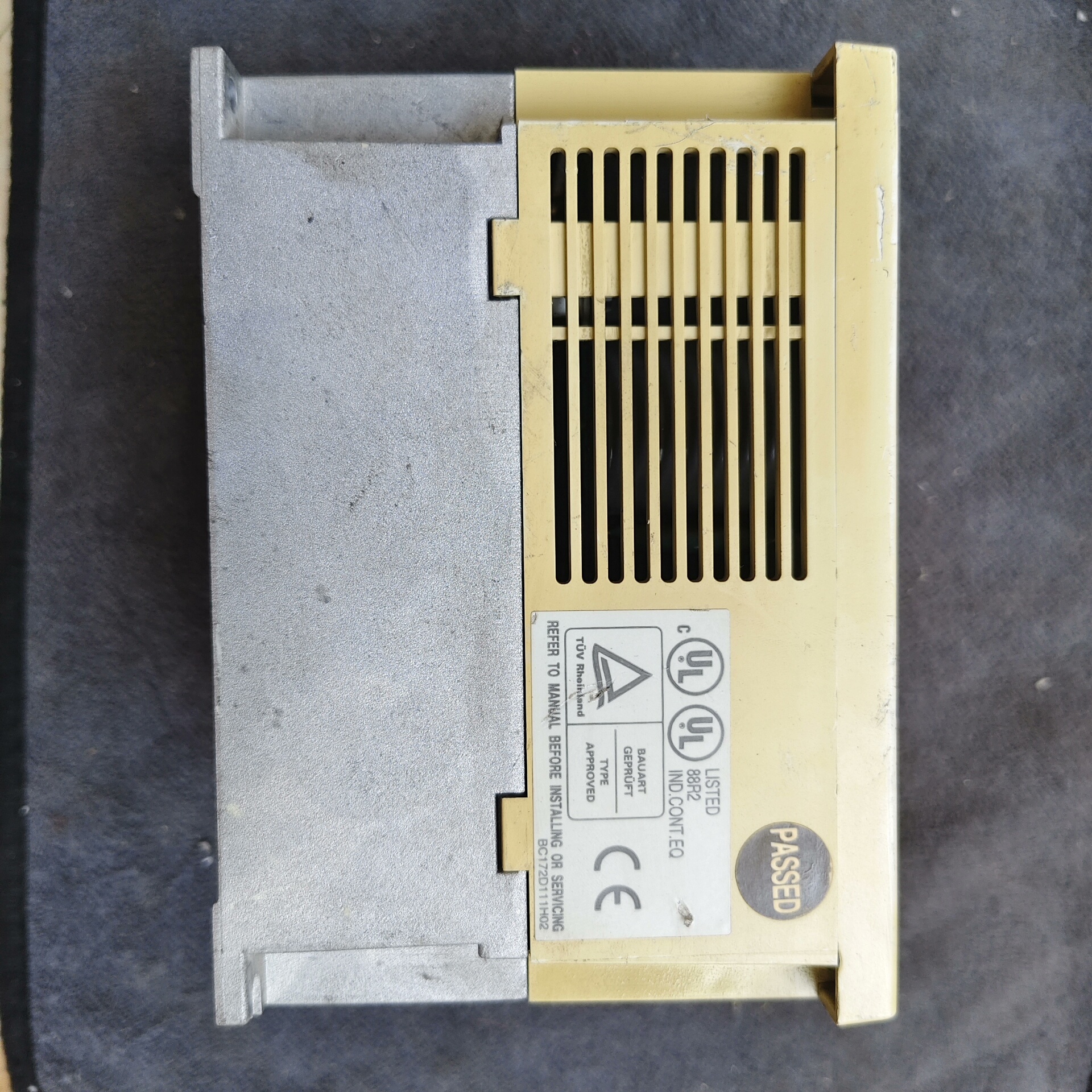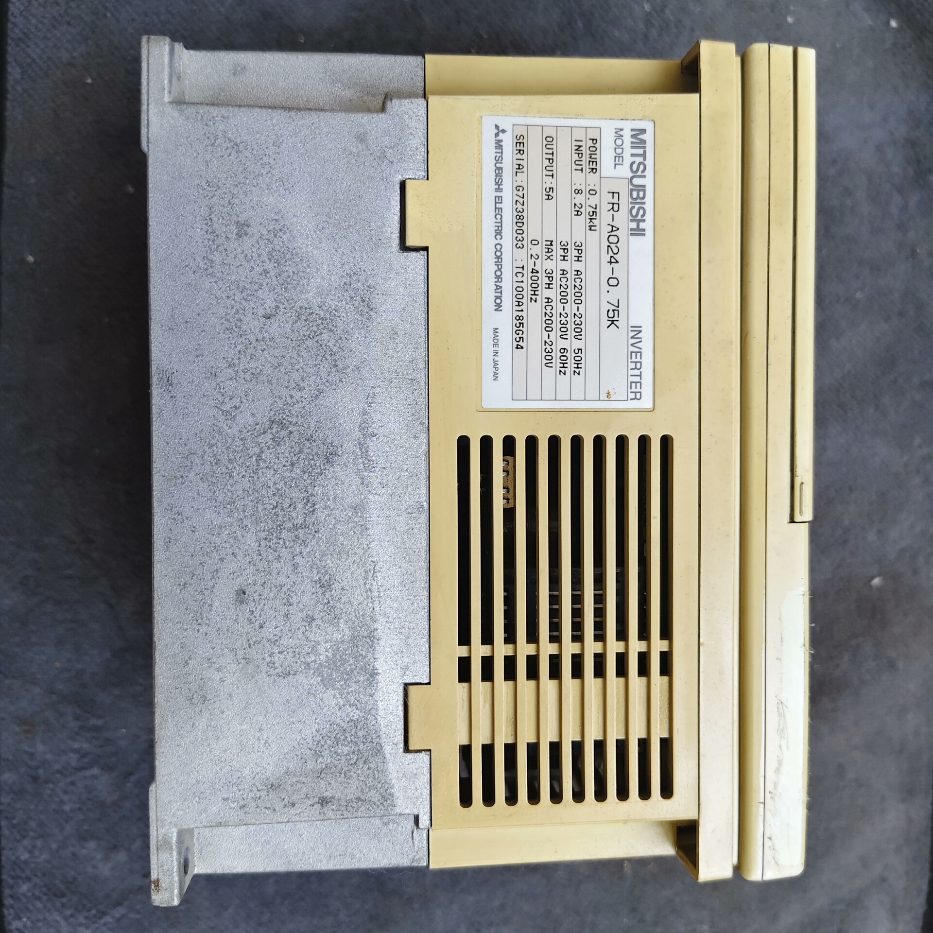 本产品为MITSUBISHI三菱FR-A024-0.75K变频器拆机件,属于三菱经典变频器系列,设计用于工业电机的调速控制。设备为黄色外壳,集成参数单元(型号FR-PU03),表面印有中日英文警示说明及操作注意事项,确保使用安全。