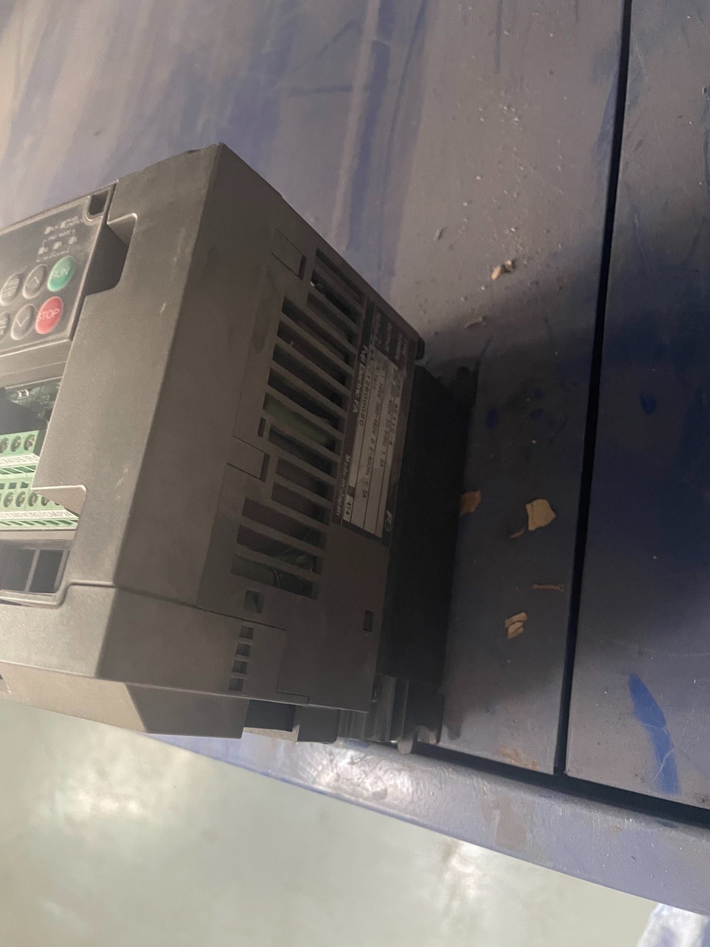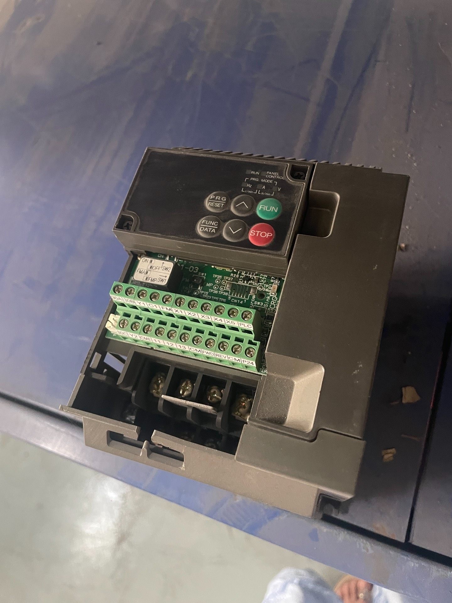 该变频器采用先进的数字控制技术,具备高效能、高稳定性与良好的抗干扰能力。面板配备RUN、STOP、PRG RESET、FUNC DATA等操作按钮,方便用户进行参数设置与运行控制。绿色接线端子排布局清晰,便于安装与维护。