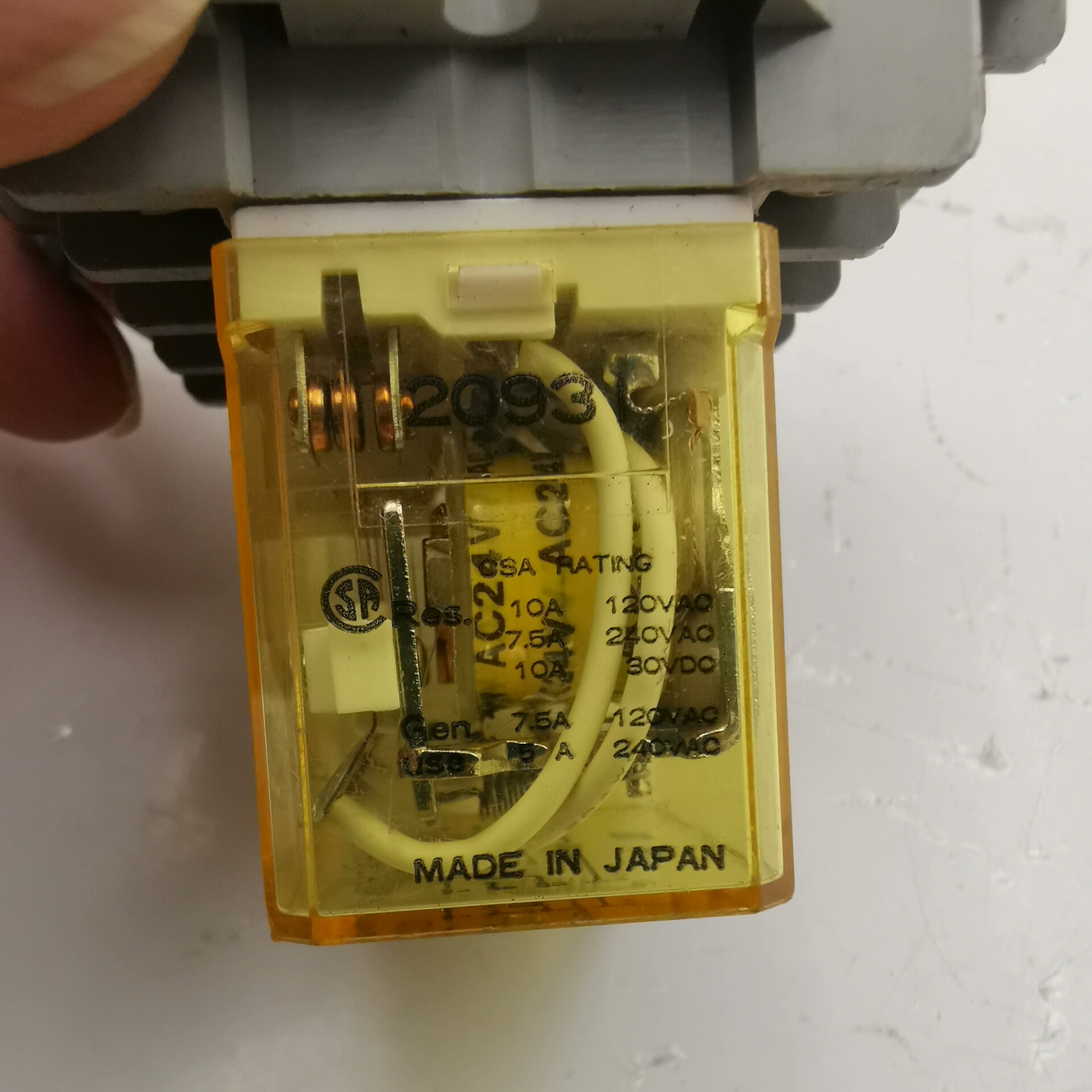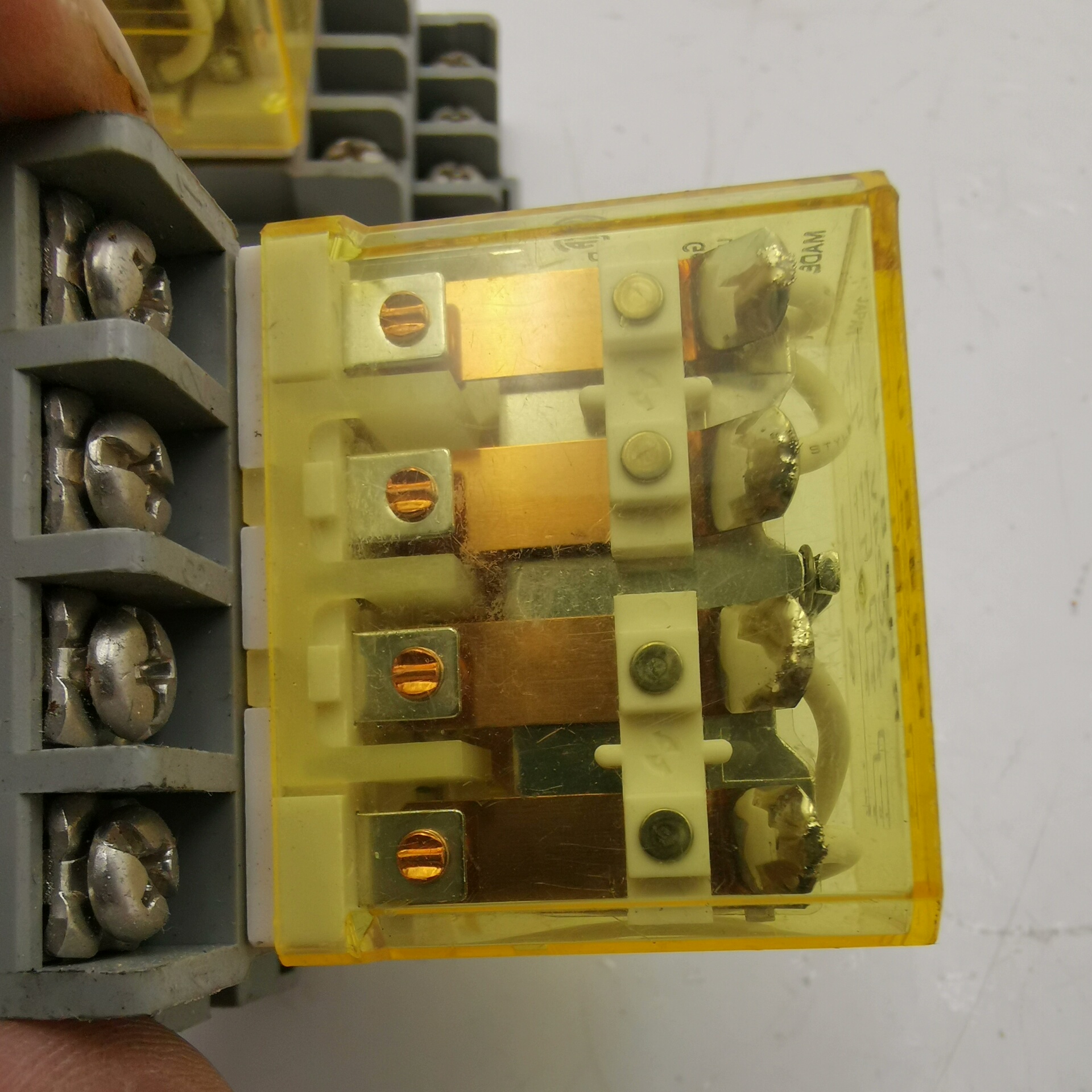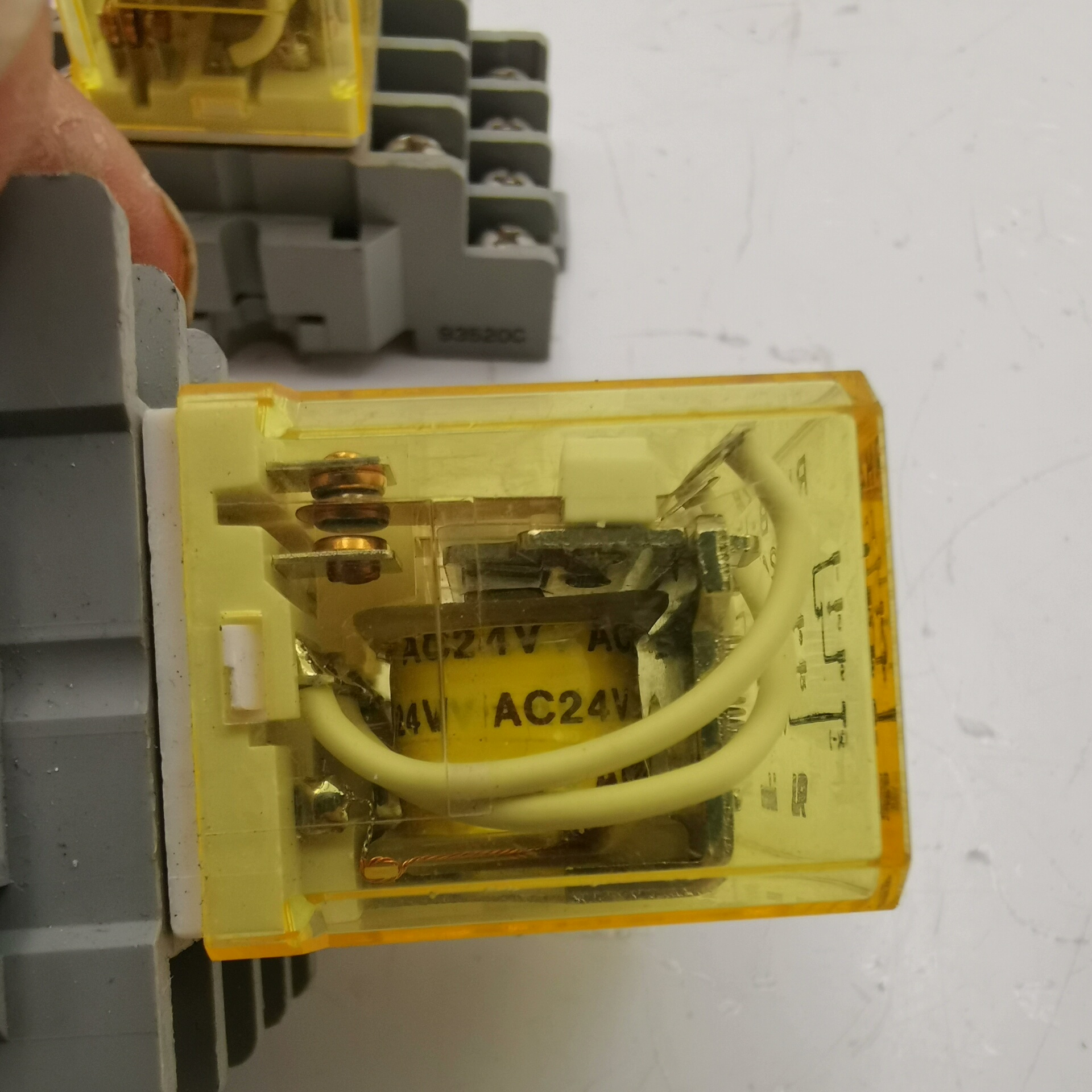 该继电器采用透明黄色外壳,内部结构清晰可见,方便安装与维护。底部设有多个接线端子,支持多路电气连接,满足复杂电路需求。产品经过严格测试,确保在各种环境下都能稳定运行。