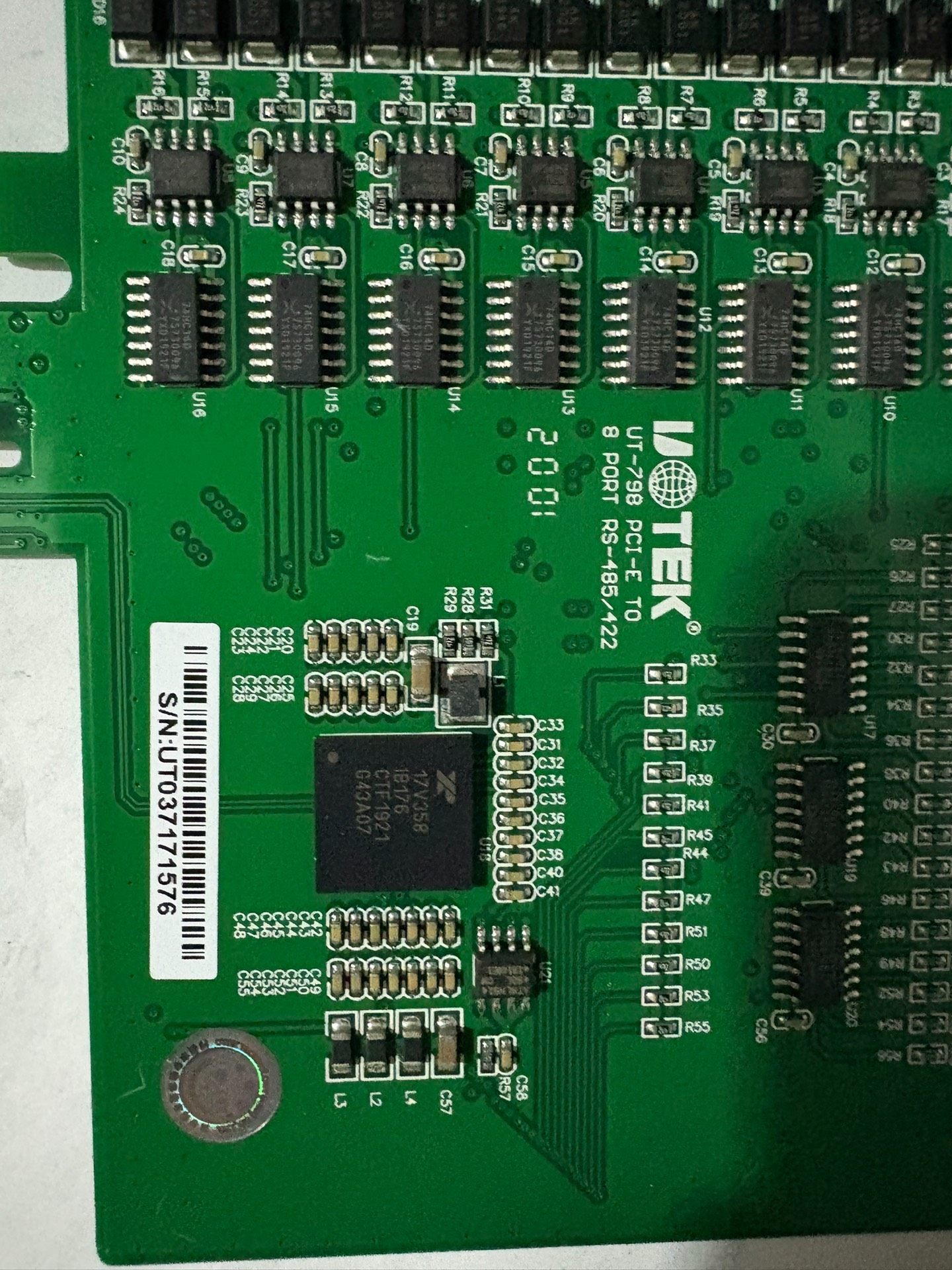 宇泰UT-798是一款高性能的PCI-E转8口RS485/422多串口扩展卡,专为工业自动化和数据采集系统设计。该扩展卡采用绿色PCB板设计,配备多个集成电路芯片和连接器,确保稳定可靠的信号传输。