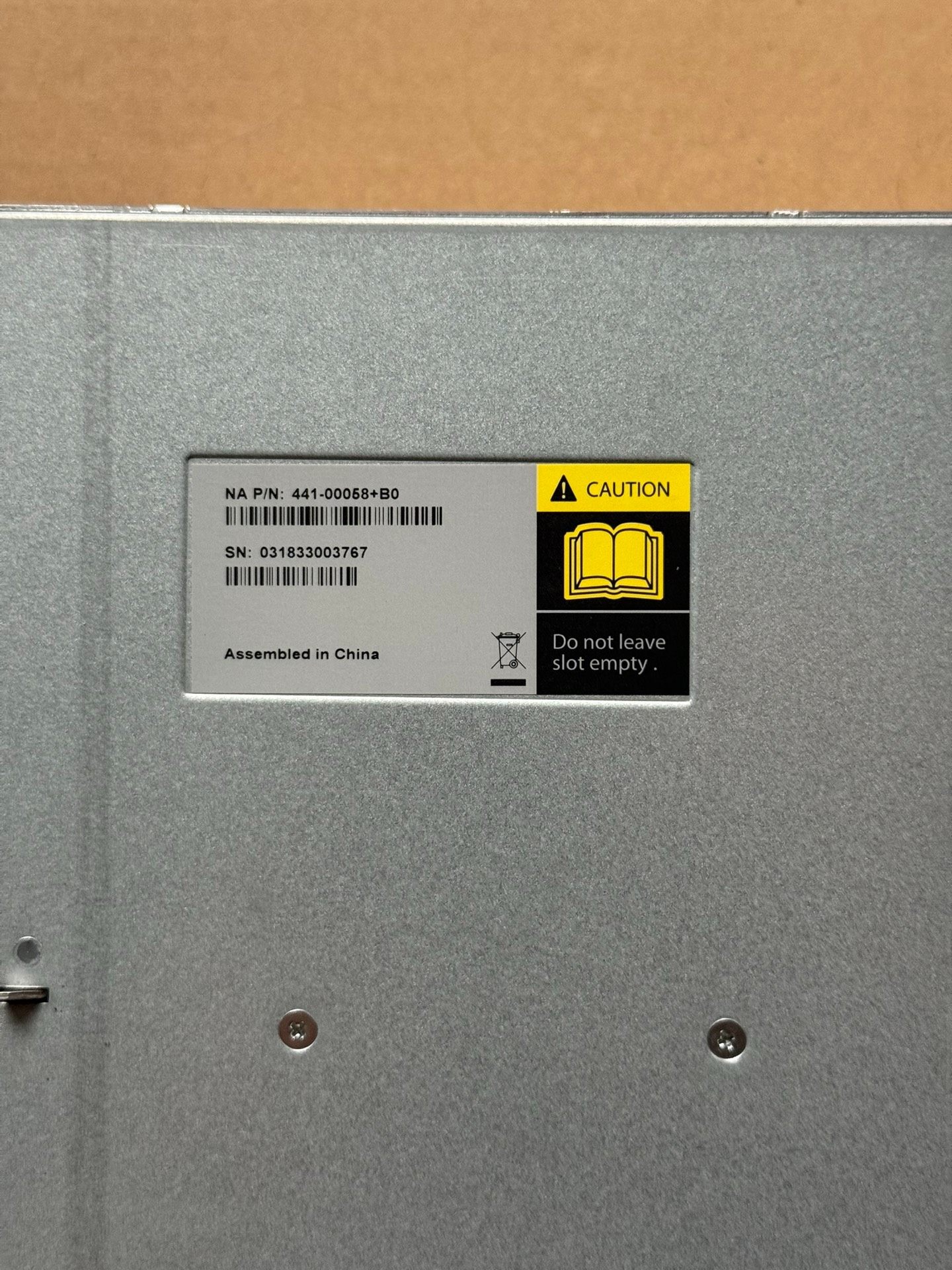 标签提示“Do not leave slot empty”,说明该风扇安装位置不可空置,否则可能影响设备正常工作。请在专业指导下进行安装与更换。