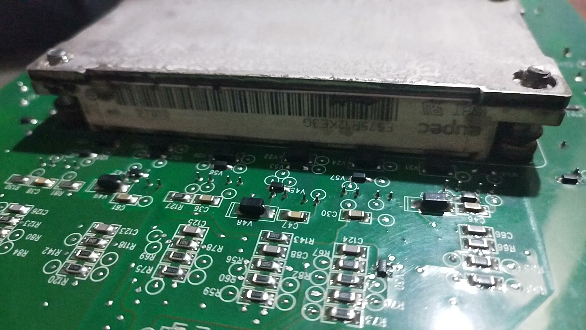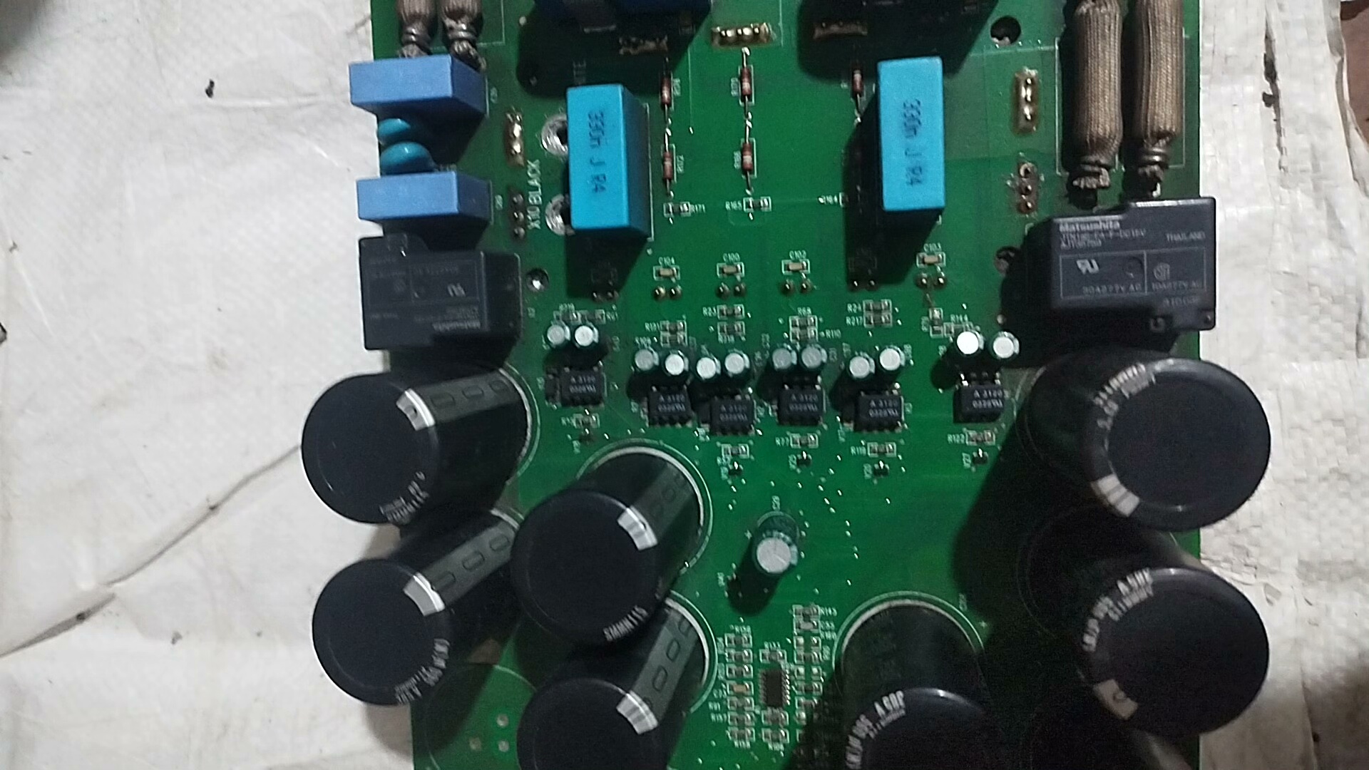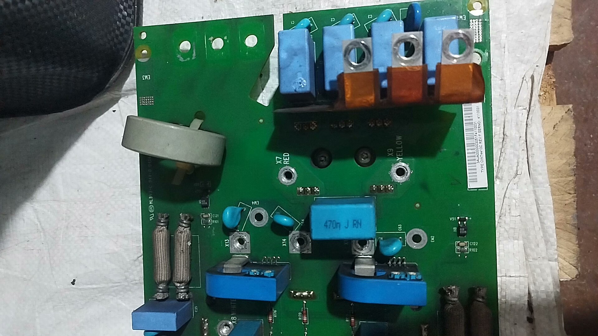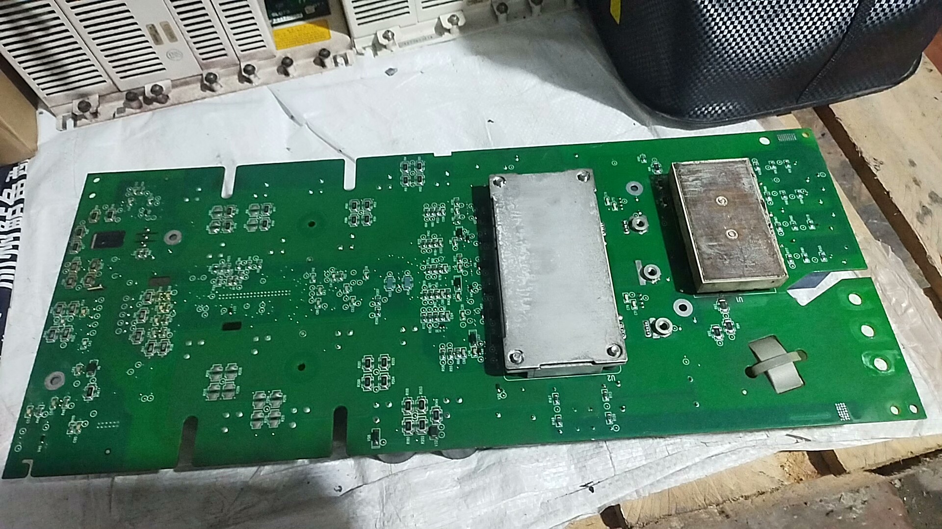该驱动板采用绿色PCB基板,布局紧凑,集成多个关键电子元件,包括大容量电解电容、蓝色贴片电感、散热模块以及多组接线端子。所有元器件均保持原始状态,未见烧毁或更换痕迹,确保其在工业环境中长期稳定运行。