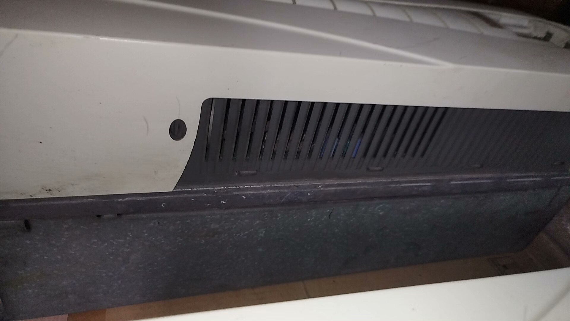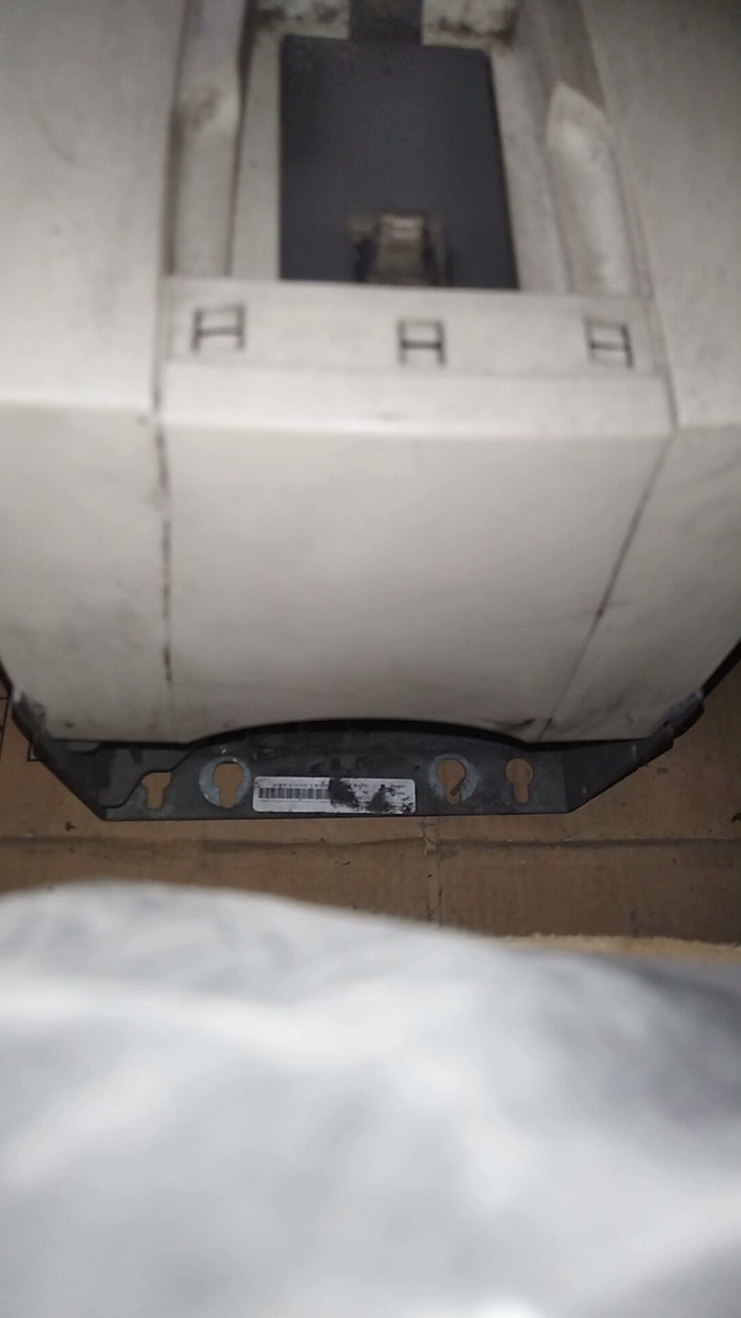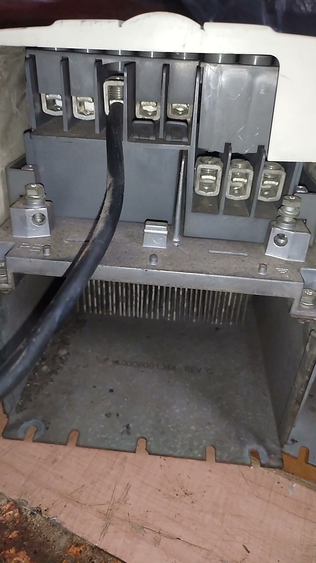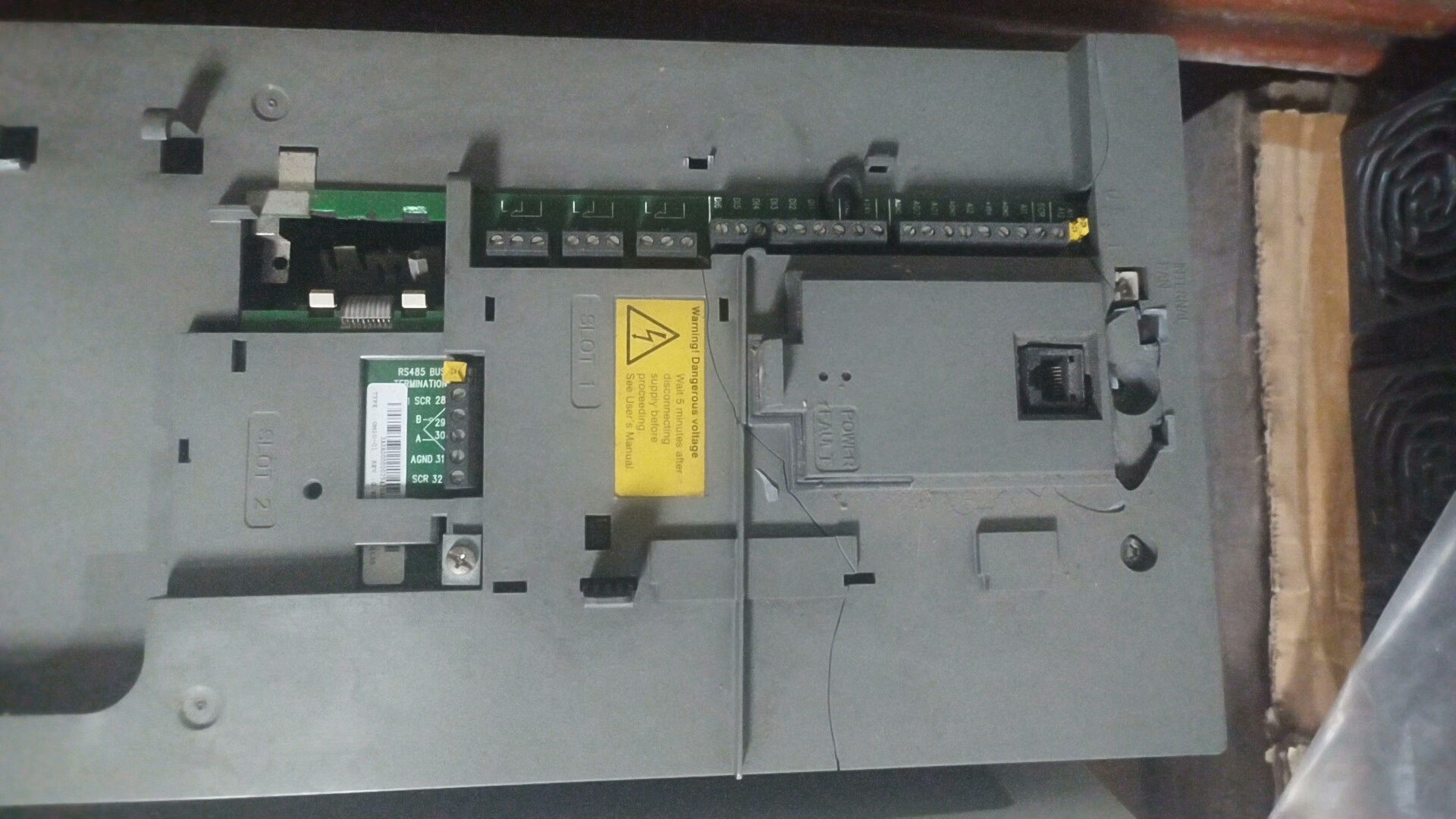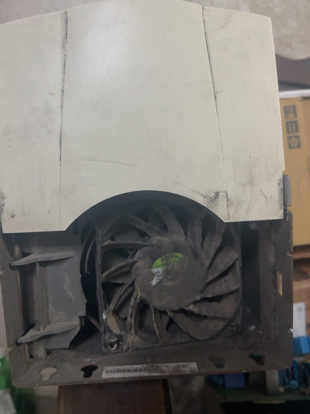 产品外壳为白色,顶部设有显示屏窗口(用于参数设置与状态显示),中部采用多段式盖板设计(便于接线与维护),底部印有黄色高压警告标志(提示安全操作)。目前存在灰壳破裂、风扇损坏的外观及部件问题,但不影响核心功能使用。