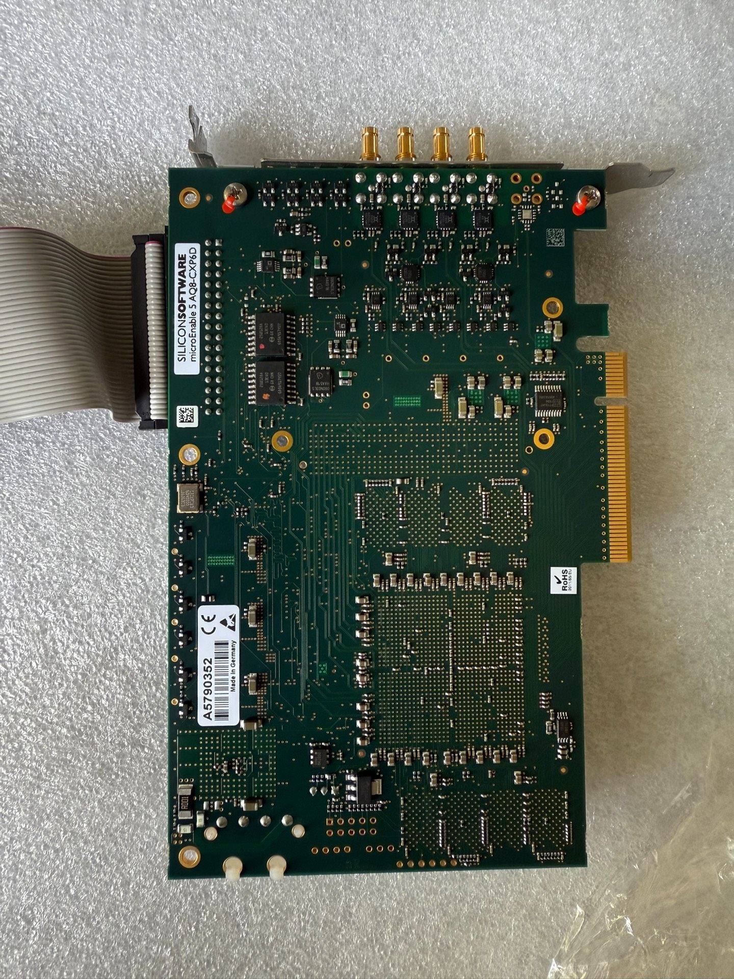 - 灵活接口配置:顶部设有4个金色SMA接口,右侧通过白色排线(VEGA E163525)扩展连接,适配多种工业相机及外围设备。