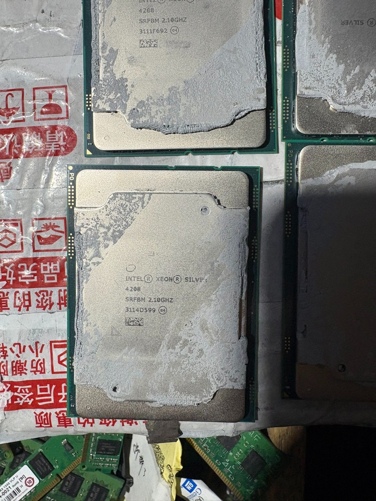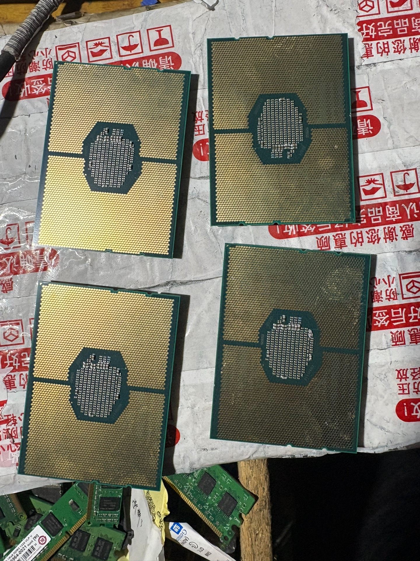 图片中展示的是四颗同型号的处理器,表面虽有轻微氧化和散热膏残留,但不影响其正常工作性能。这些CPU通常用于构建高可靠性的服务器平台,支持虚拟化技术,广泛应用于企业级IT架构中。