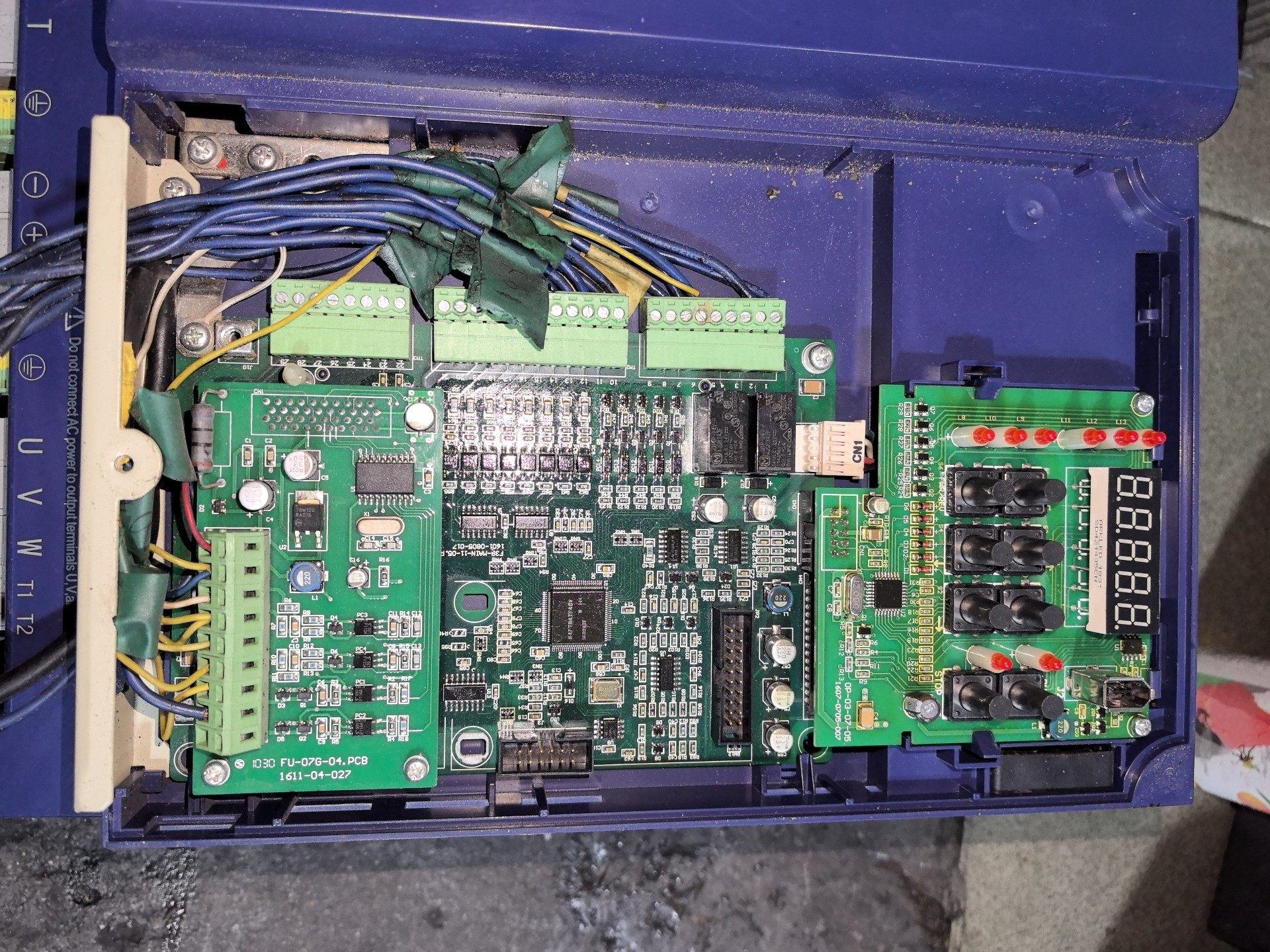 该变频器采用先进的控制技术,具备良好的稳定性和可靠性。控制面板设计简洁,配备数字显示屏和多个功能按键,方便用户进行参数设置和监控。设备表面无明显划痕或损坏,成色良好,功能正常。