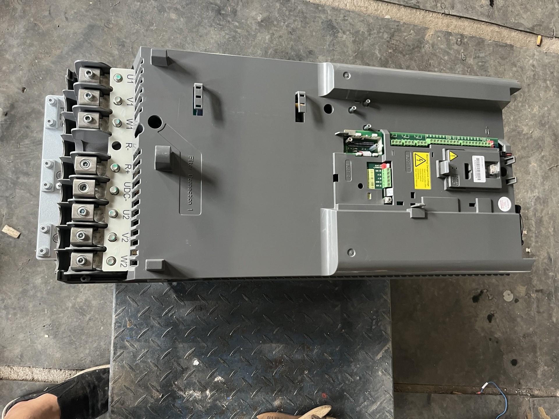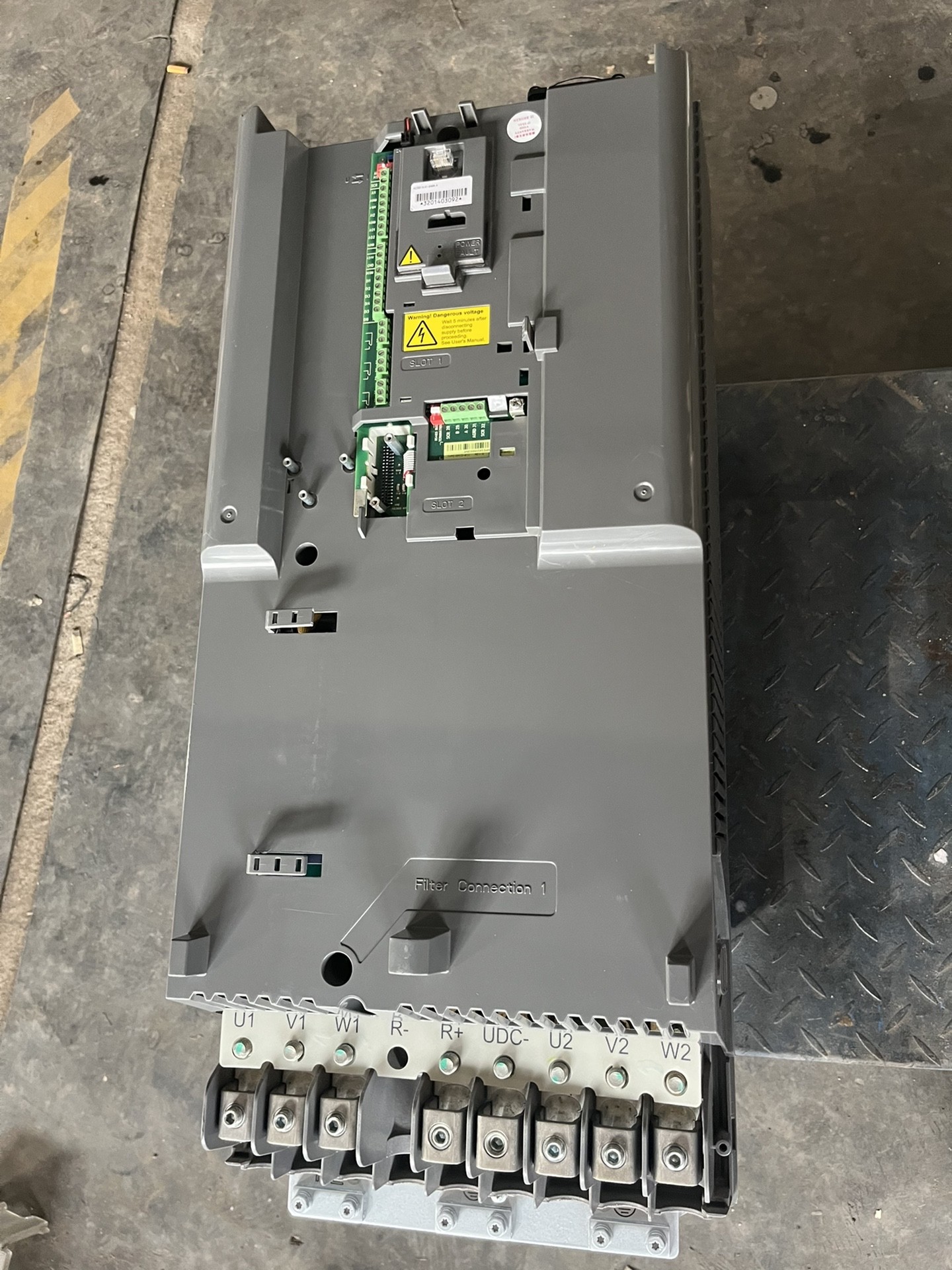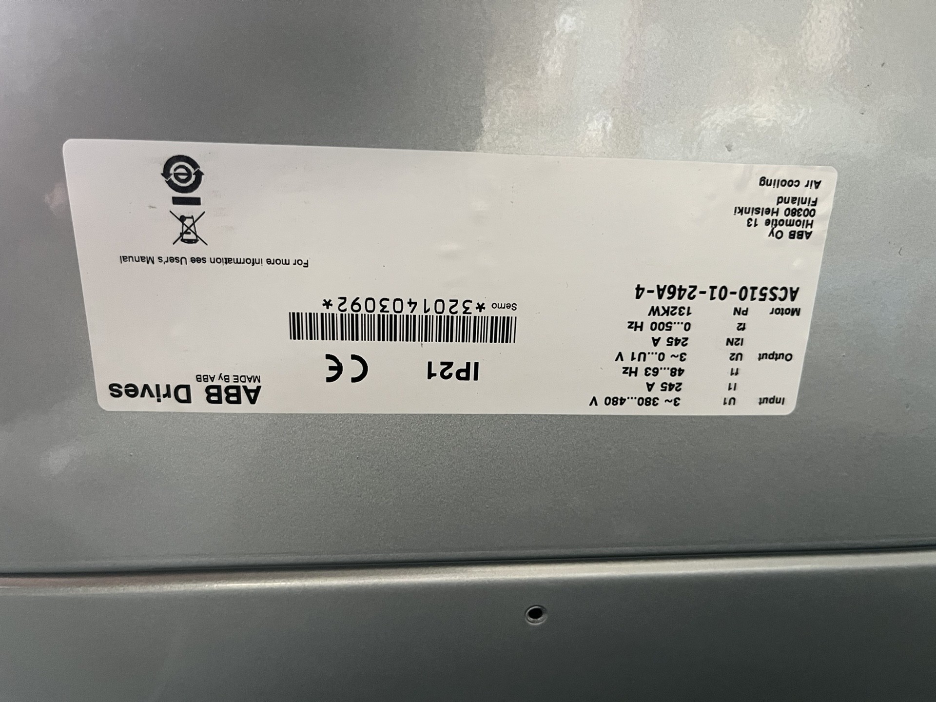 本产品为二手拆机的ABB ACS510系列变频器,型号为ACS510-01-246A-4,额定功率132KW,额定电流246A。设备外观为白色长方体结构,顶部配备显示屏及操作按钮,表面设计有散热条纹,确保良好的散热性能。经过专业检测,设备功能完好,可正常投入工业生产使用,并提供质保服务。