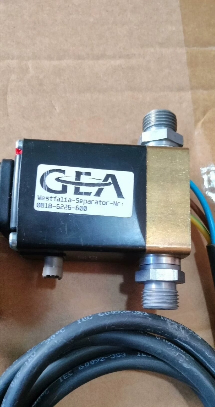 GEA分油机电磁阀(型号:0018-6226-600)是一款专为分油机设备设计的工业控制元件,用于精确控制流体的通断,确保分油机在运行过程中的稳定与高效。产品为全新件,附带专用电缆,适用于工业自动化流体控制系统。