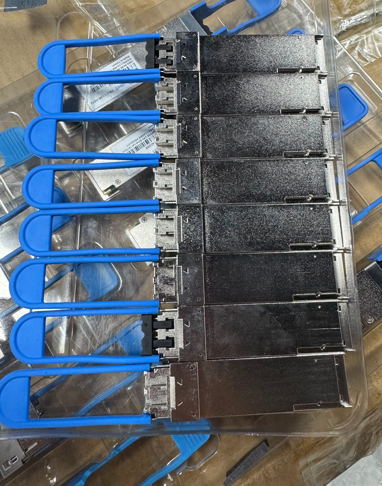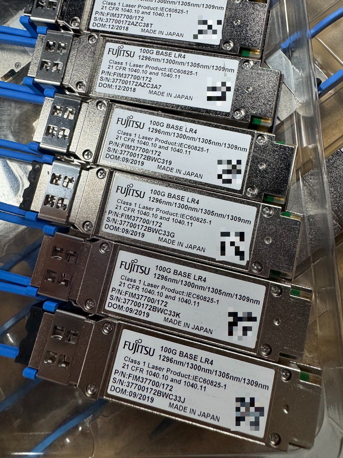 FUJITSU 100G BASE LR4 光模块是一款高性能的光通信传输组件,专为高速、长距离数据传输设计。产品采用银色金属外壳,结构坚固,配备蓝色拉环,便于安装与维护。每个光模块均通过严格的质量检测,符合国际激光安全标准及通信行业规范,确保稳定可靠的运行。