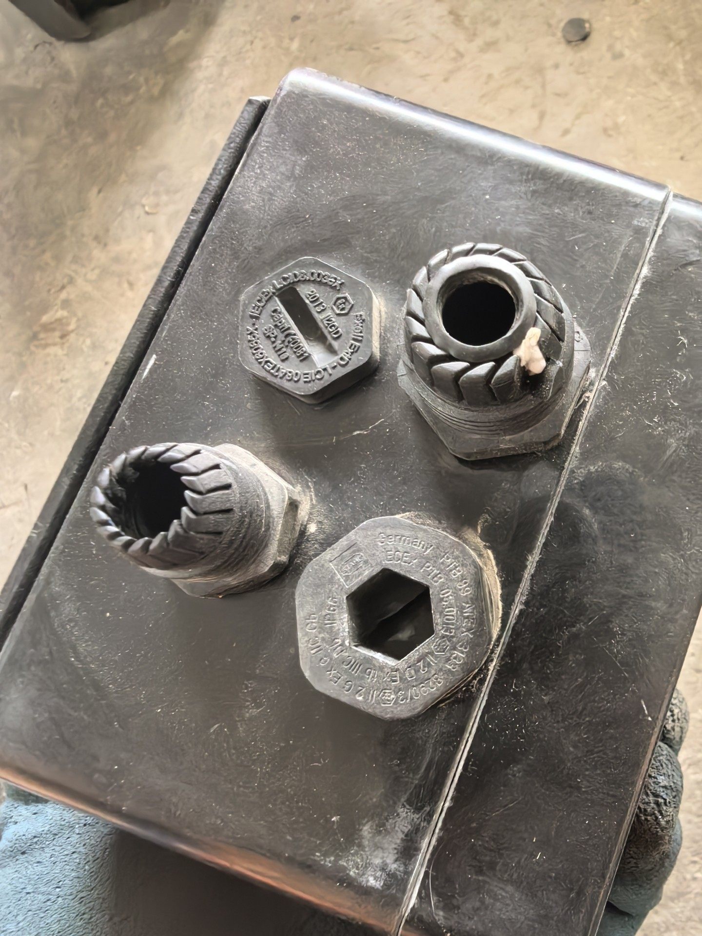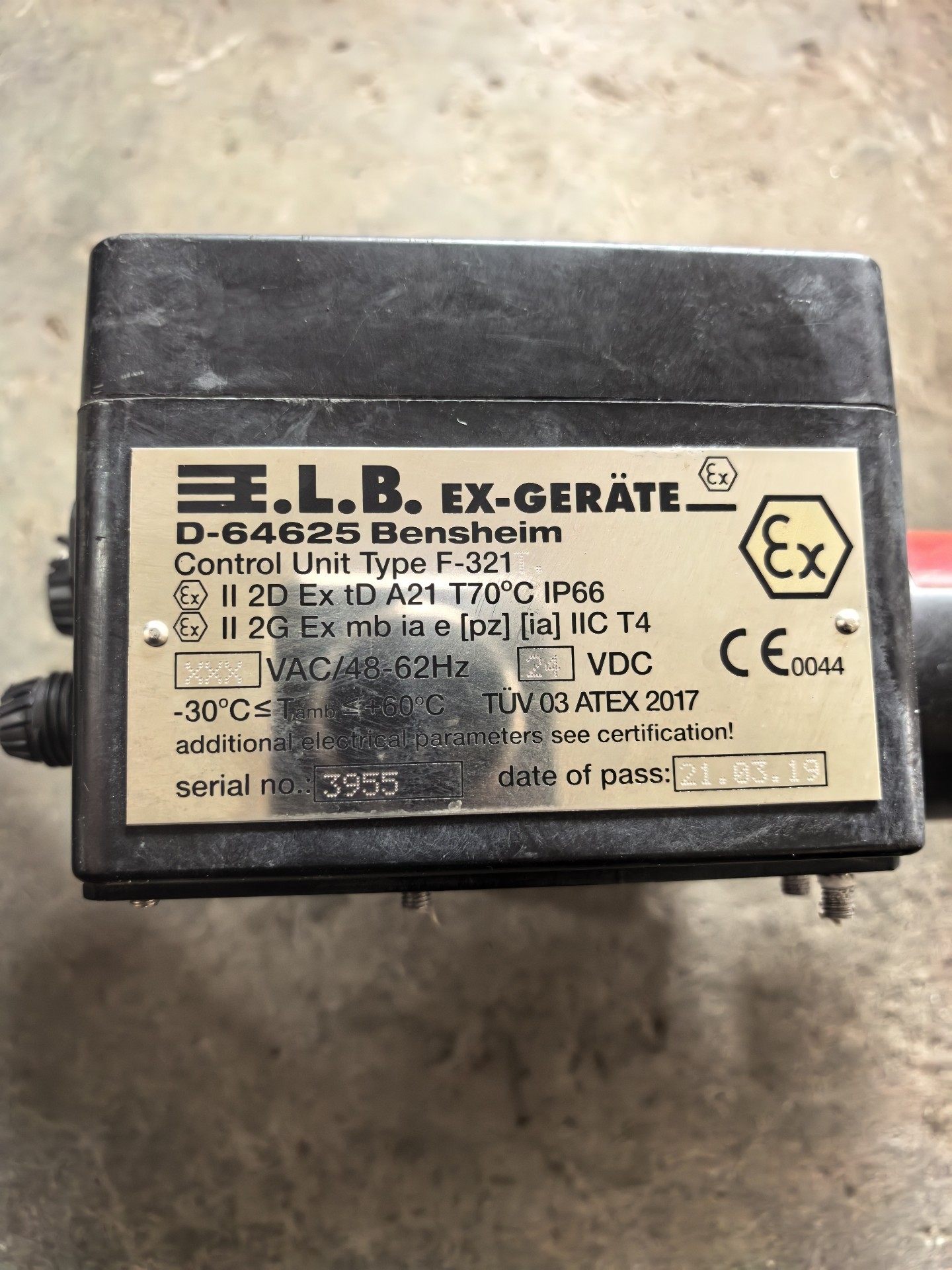 德国E.L.B. F-321防爆吹扫控制单元是一款工业级安全控制设备,采用黑色方形外壳设计,结构坚固耐用,适用于恶劣工业环境。正面配备圆形显示屏及INFO、MENU操作按钮,方便参数查看与设置。顶部设有红色警示标签,提示静电危害及清洁注意事项,确保操作安全。设备外观有使用痕迹,为二手工业设备。
