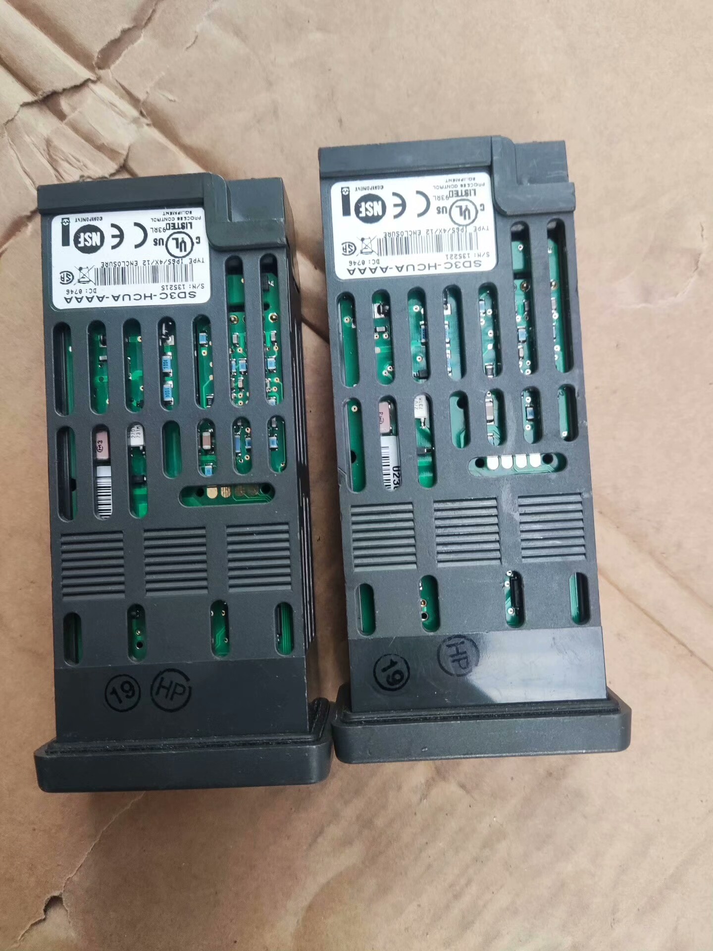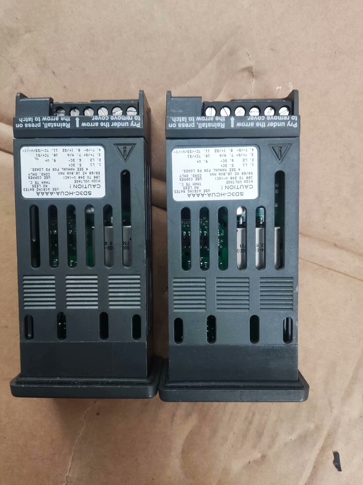 本品为瓦特隆(Watlow)品牌工业温控器,型号SD3C-HCUA-AAAA,共计两个,成色如图所示。设备采用黑色外壳设计,正面配备清晰的LCD显示屏及四个操作按键(含绿色功能键与黑色方向调节键),顶部设有“SD”标识及“1 2 %”符号,适用于各类工业场景下的温度精确调控。