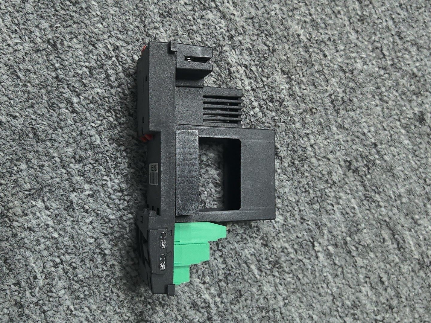 PD622/BM005模块底座采用高强度黑色塑料材质制造,具备良好的结构稳定性和耐用性。产品设计有多处卡扣和安装接口,便于快速安装与拆卸,顶部和中部的固定结构可确保模块连接稳固,底部红色定位卡扣进一步提升安装精度,防止模块移位。表面集成条形码标签(编号10467934),便于产品追溯与库存管理。
