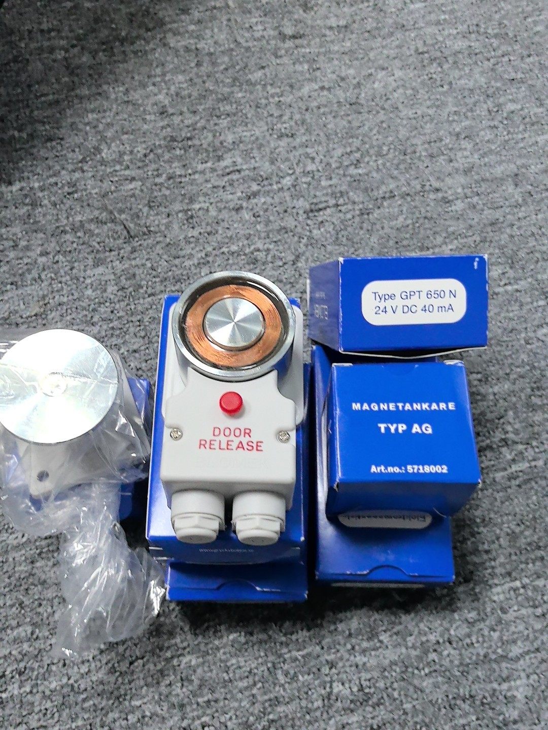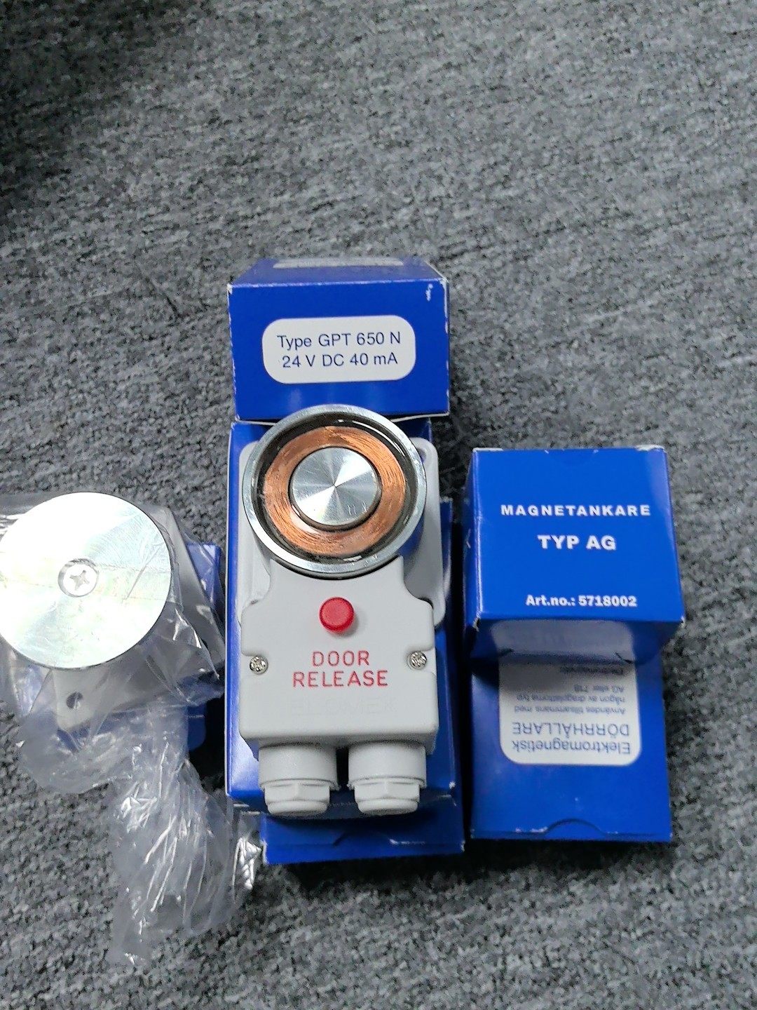 ELOMEK GPT650N 是一款专为工业安全门设计的电磁释放装置,适用于需要远程或自动控制门体释放的场景。产品采用白色主体设计,顶部配备金属圆盘,正面设有醒目的红色“DOOR RELEASE”按钮,整体结构紧凑,安装便捷,全新原装,性能稳定可靠。