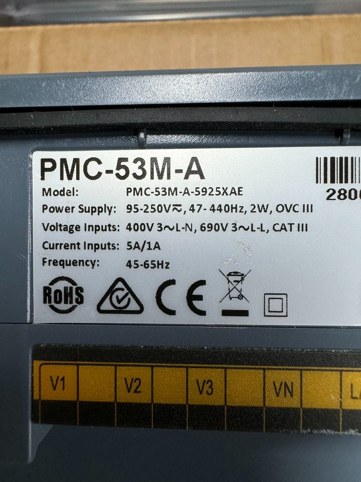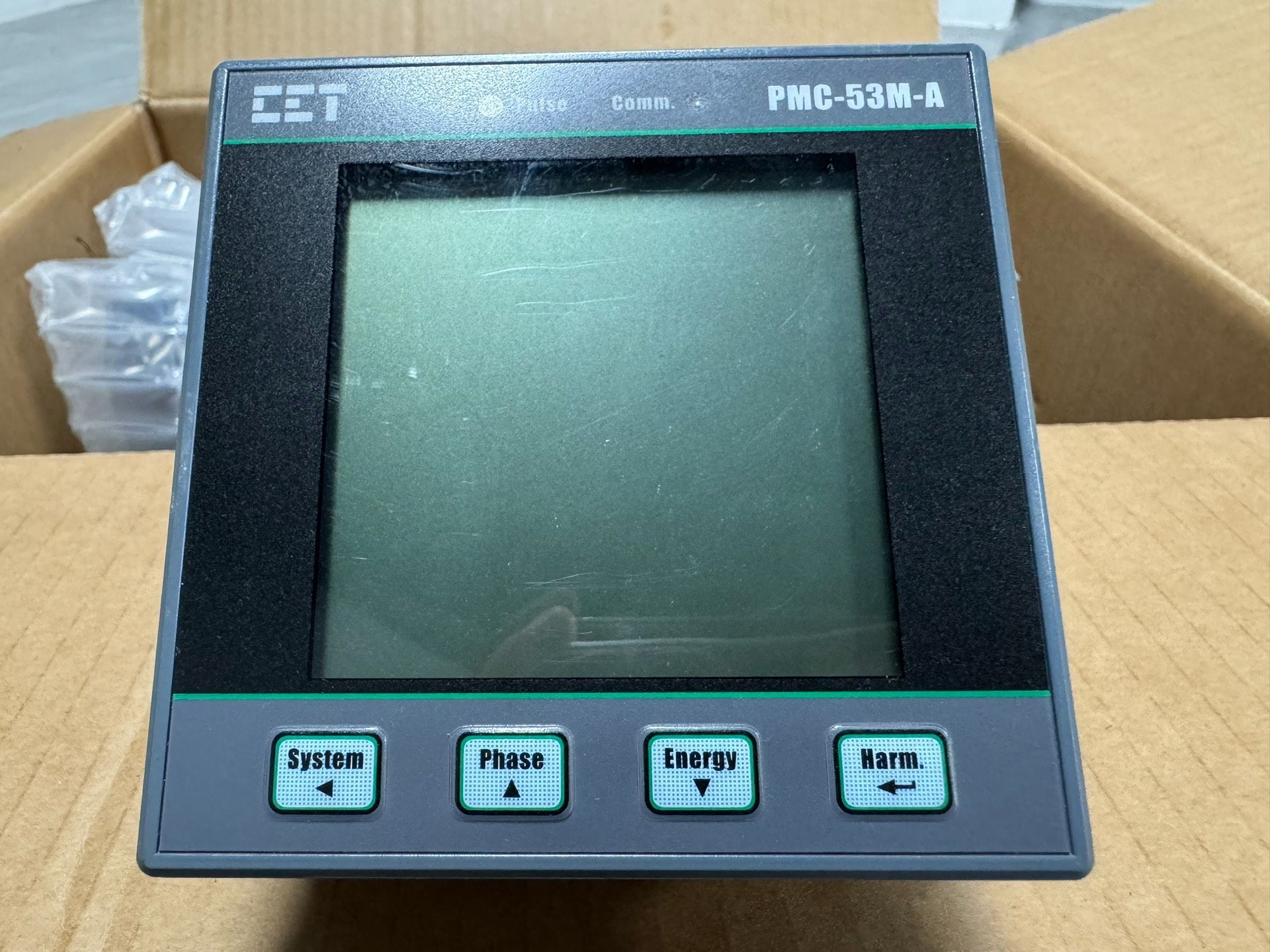 中电 PMC-53M-A 数字式多功能测控电表是一款高性能的电力参数测量与监控设备。其采用黑色外壳搭配绿色边框设计,外观简洁大方,正面配备清晰的显示屏,可直观显示各项电力参数。设备设有System、Phase、Energy、Back四个操作按键,便于用户进行参数查询与设置,操作便捷。