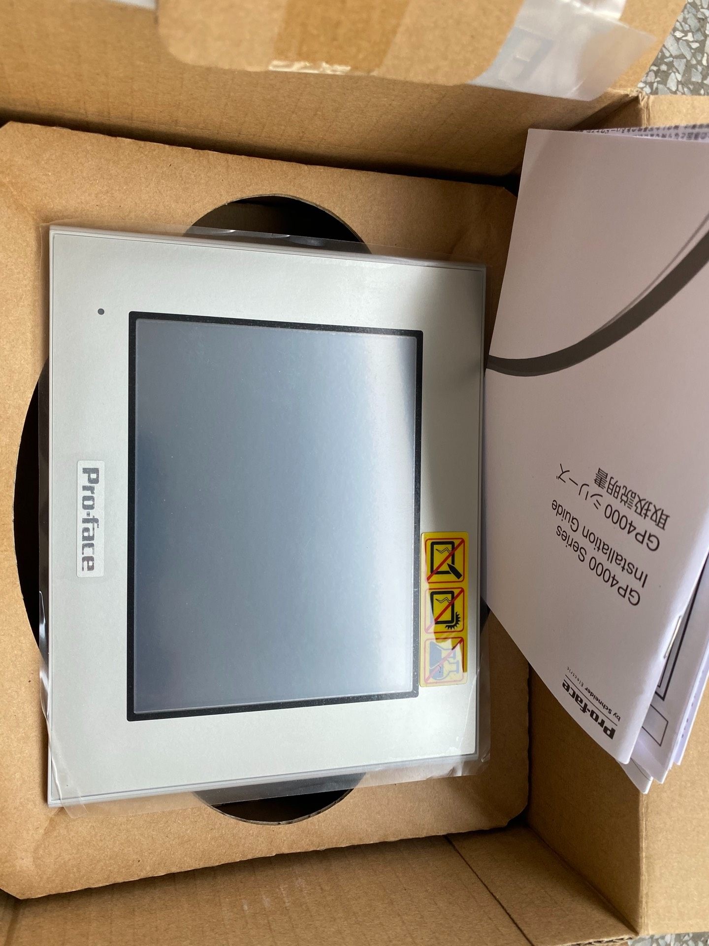 Pro-face普洛菲斯GP-4301TW(型号PFXGP4301TADW)工业触摸屏是一款专为工业自动化场景设计的人机交互界面设备。采用高品质灰色外壳,结构坚固耐用,能适应工厂复杂的环境。正面配备清晰显示屏,支持触摸操作,侧面设有散热孔,确保设备在长时间运行时保持稳定性能。设备正面贴有警示标签,提示正确的使用和维护方式,保障操作安全。