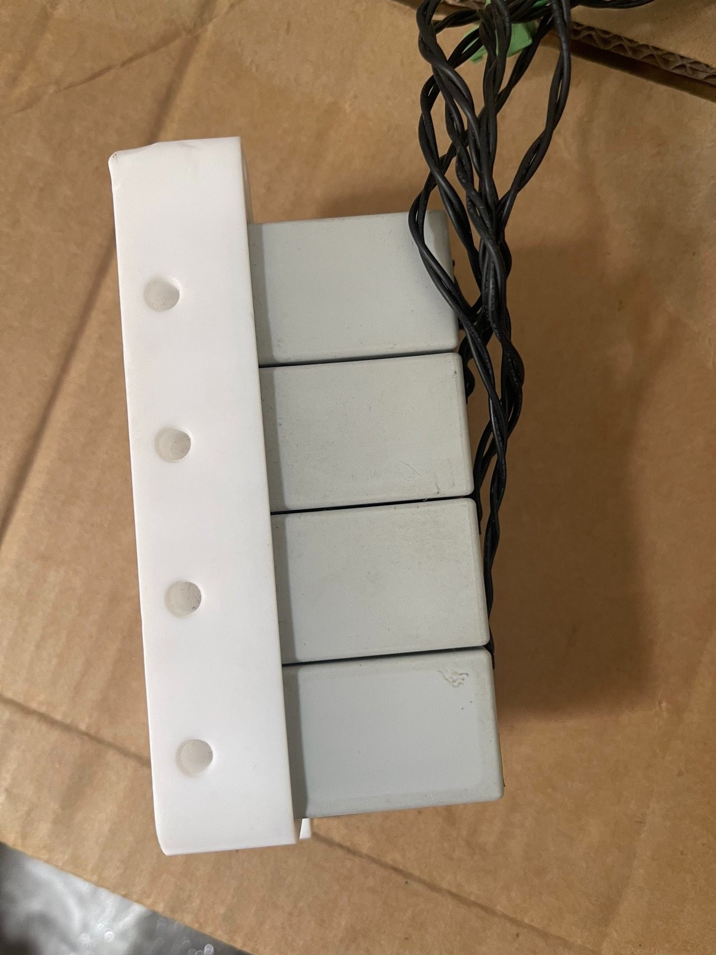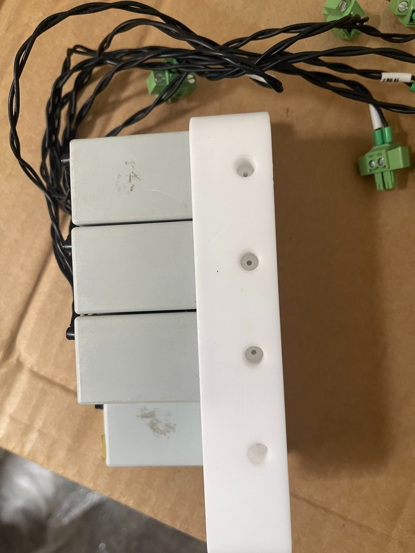 深圳世绘林七排阀汇流板采用优质白色塑料材质制成,结构坚固耐用,表面设计七排共28个金属螺丝孔位,排列整齐,便于精准安装多个电磁阀。顶部配备安装孔,可便捷固定于设备或支架上,附带黑色连接电线及绿色接线端子,整体布局合理,安装维护方便。