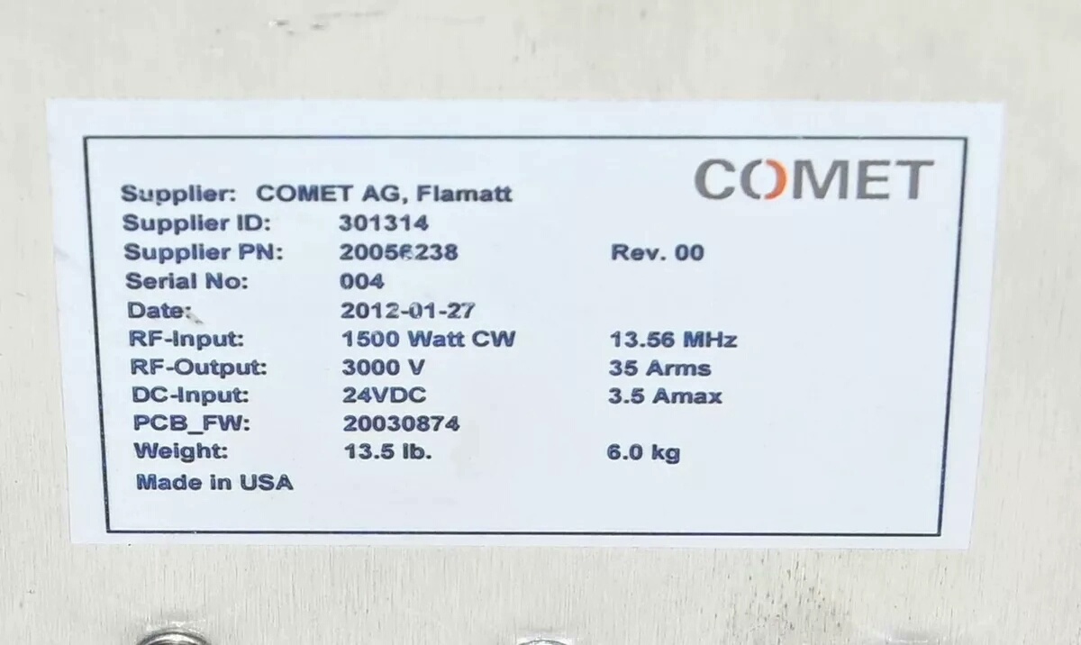本产品为COMET品牌的RF Match射频匹配器,型号20056238,为二手设备。射频匹配器是射频系统中的关键组件,主要用于匹配射频源与负载之间的阻抗,确保射频功率高效传输,减少反射损耗,广泛应用于半导体制造、射频加热、科研实验等射频相关领域。