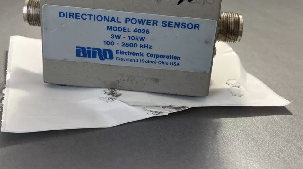 Bird 4025定向射频推力传感器是一款专为射频信号测量设计的精密设备,采用金属外壳封装,具备良好的电磁屏蔽性能和机械强度。设备顶部可见手写“Echo”标识,正面配备标准N型射频连接器,便于快速接入射频系统,实现信号的定向推力检测与测量。