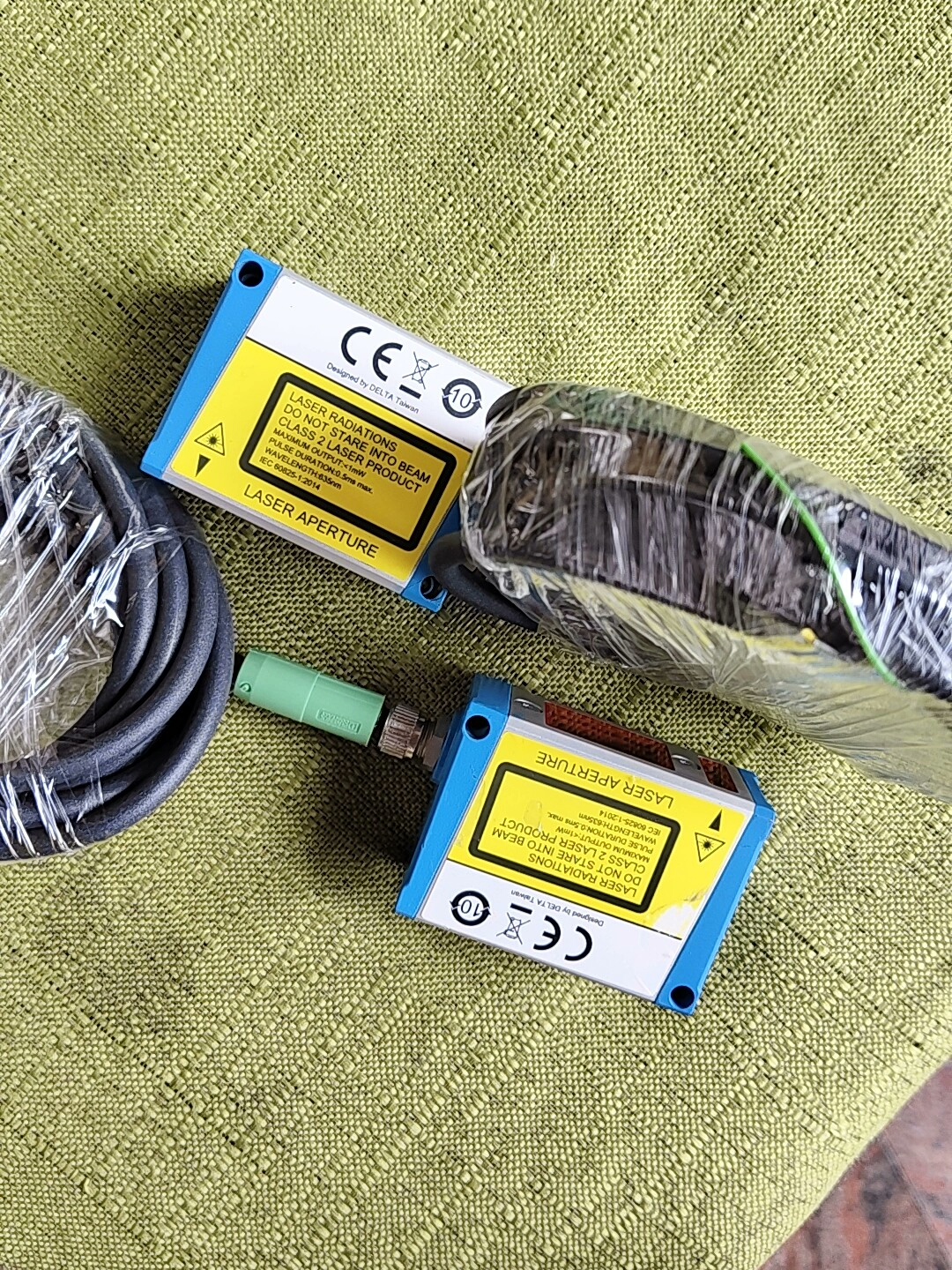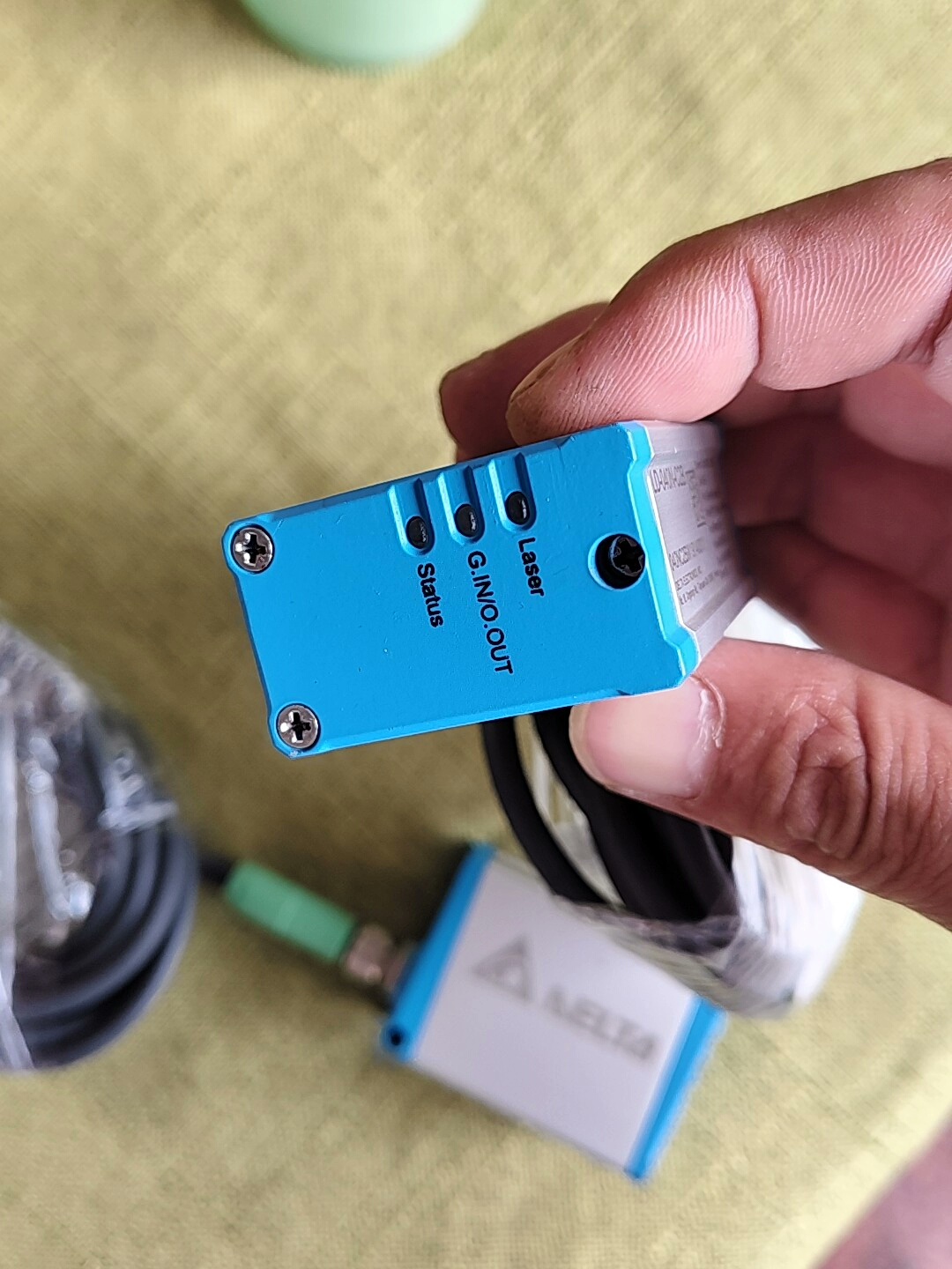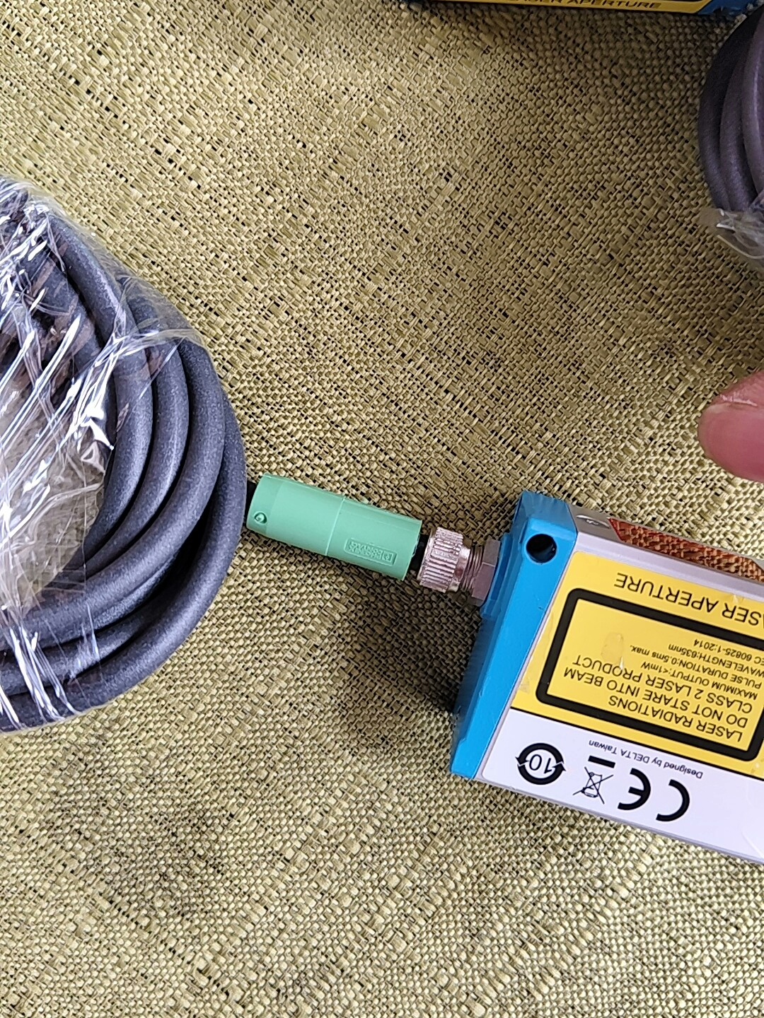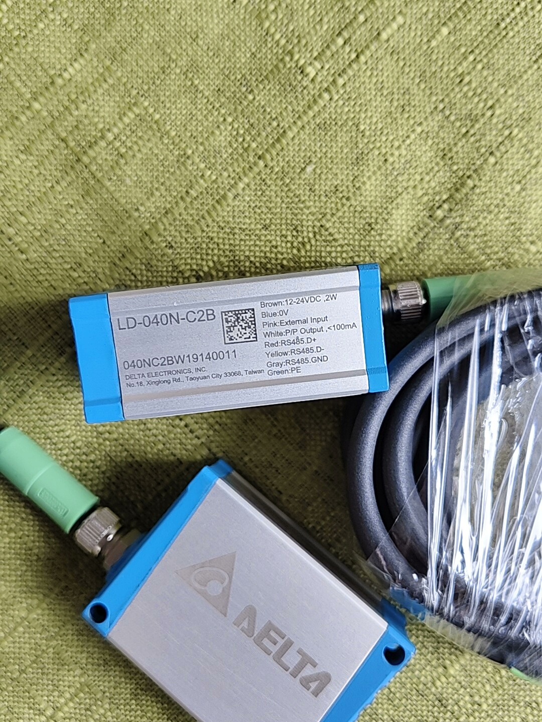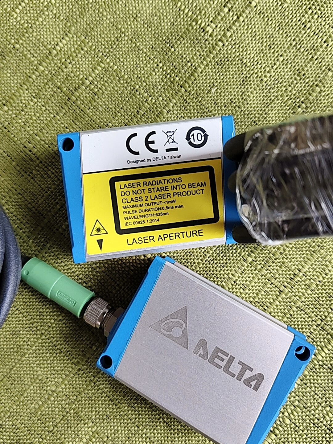 台达激光位移传感器 LD-040N-C2B 是一款高精度非接触式测量设备,专为工业自动化场景设计,具备稳定的性能和便捷的安装特性。产品采用蓝白相间的方形外壳,集成激光发射与接收模块,配备绿色连接器及2米长信号线缆,满足多数工业现场的布线需求。外壳上的激光警告标识提示其激光发射特性,确保使用安全。