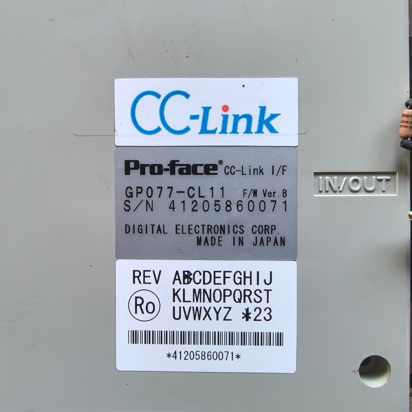 本产品为Pro-face(普洛菲斯)出品的CC-Link接口模块,型号为GP077-CL11,是工业自动化控制系统中实现设备间通信的关键组件。产品采用白色外壳设计,带有醒目的CC-Link标识,背面配备接线端子及黄、蓝、白、黑多色线缆,实物拍摄成色如图所示,性能完好,确保稳定可靠的工业通信连接。