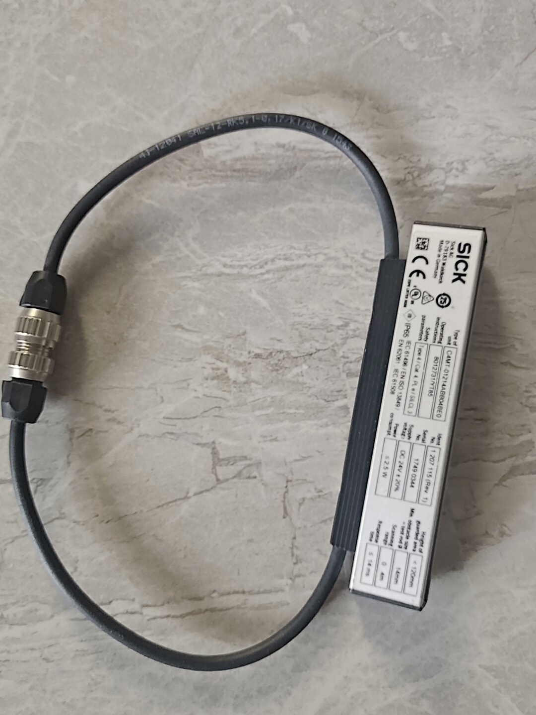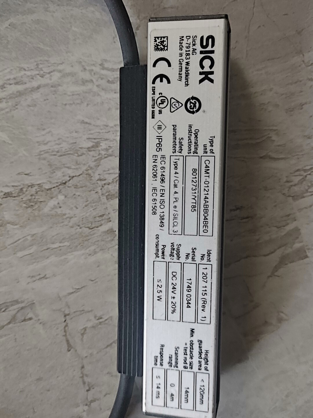 本产品为SICK(西克)品牌旗下miniTwin4系列安全光幕,型号为C4MT-01214ABB04BEO,是一款专为工业自动化领域设计的安全防护装置。产品采用黄色矩形外壳,结构紧凑,侧面清晰印有“miniTwin4”系列标识,配备黑色耐用线缆及M12标准连接器,便于快速安装与集成。