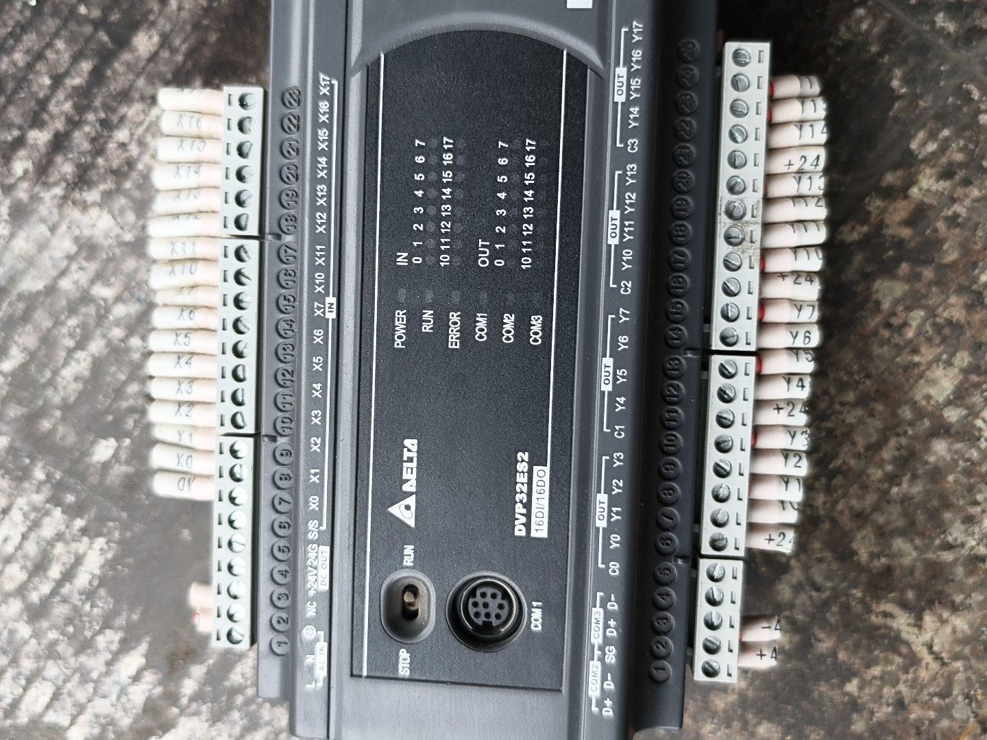 - 主模块DVP32ES32:32点I/O配置,支持数字量输入输出,集成STOP/RUN模式切换开关及通讯接口(COM1/COM2),电源电压范围覆盖24V/240V,适应不同工业供电环境。