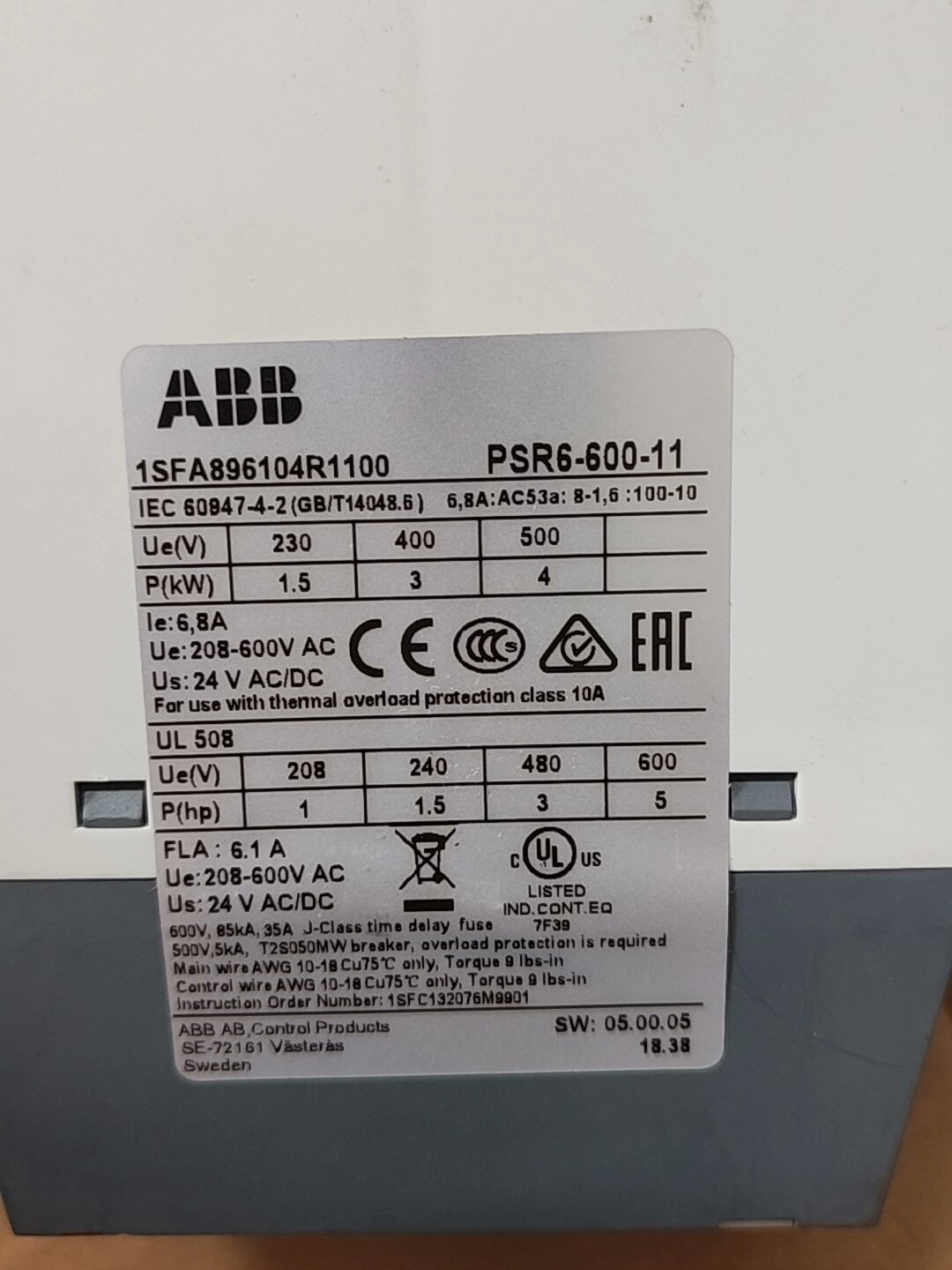 本产品为ABB品牌旗下的PSR6系列软启动器,型号为PSR6-600-11,产品编号1SFA896104R1100,属于拆机件,经检测功能完好,外观无破损,实物拍摄如图所示,江浙沪地区可提供包邮服务。