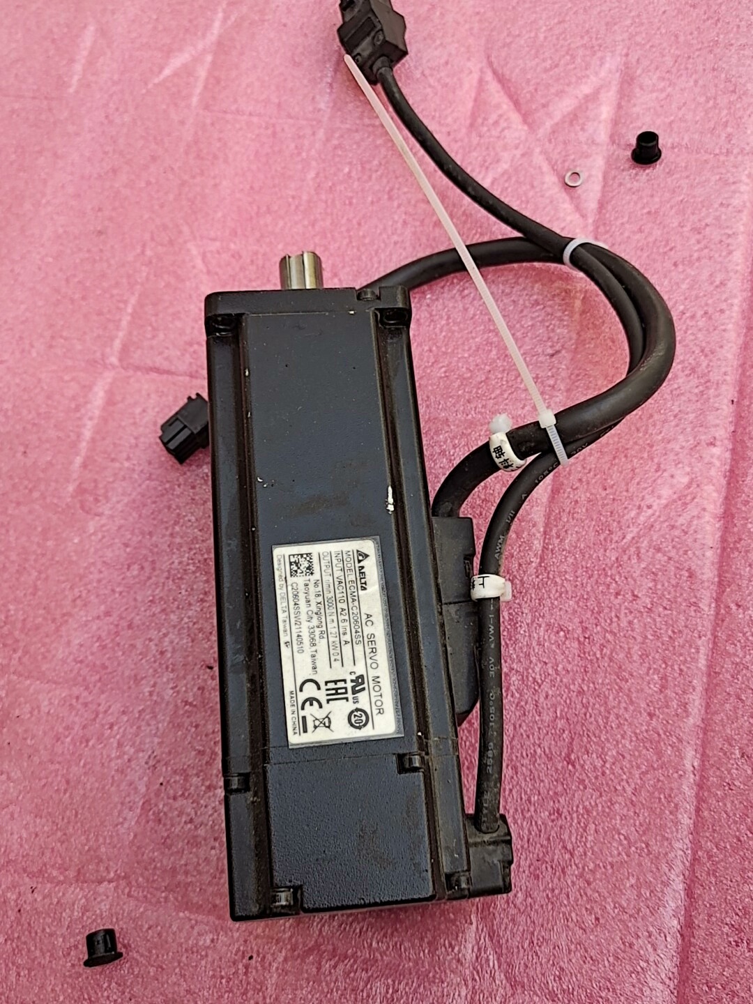 本产品为台达(DELTA)品牌的AC伺服电机,型号ECMA-C20604SS,功率400W,属于二手拆机设备。机身主体为黑色,表面有轻微使用痕迹,连接线束完整并带有固定扎带,整体成色如图所示。设备功能经过检测确保正常,适用于各类工业自动化场景的驱动控制。