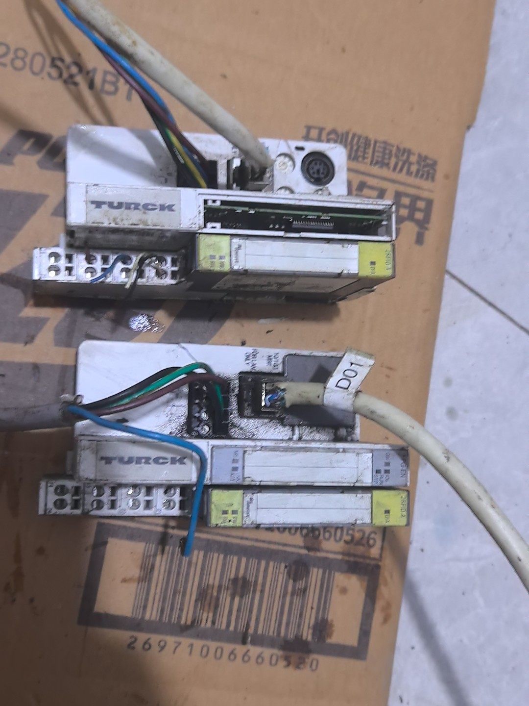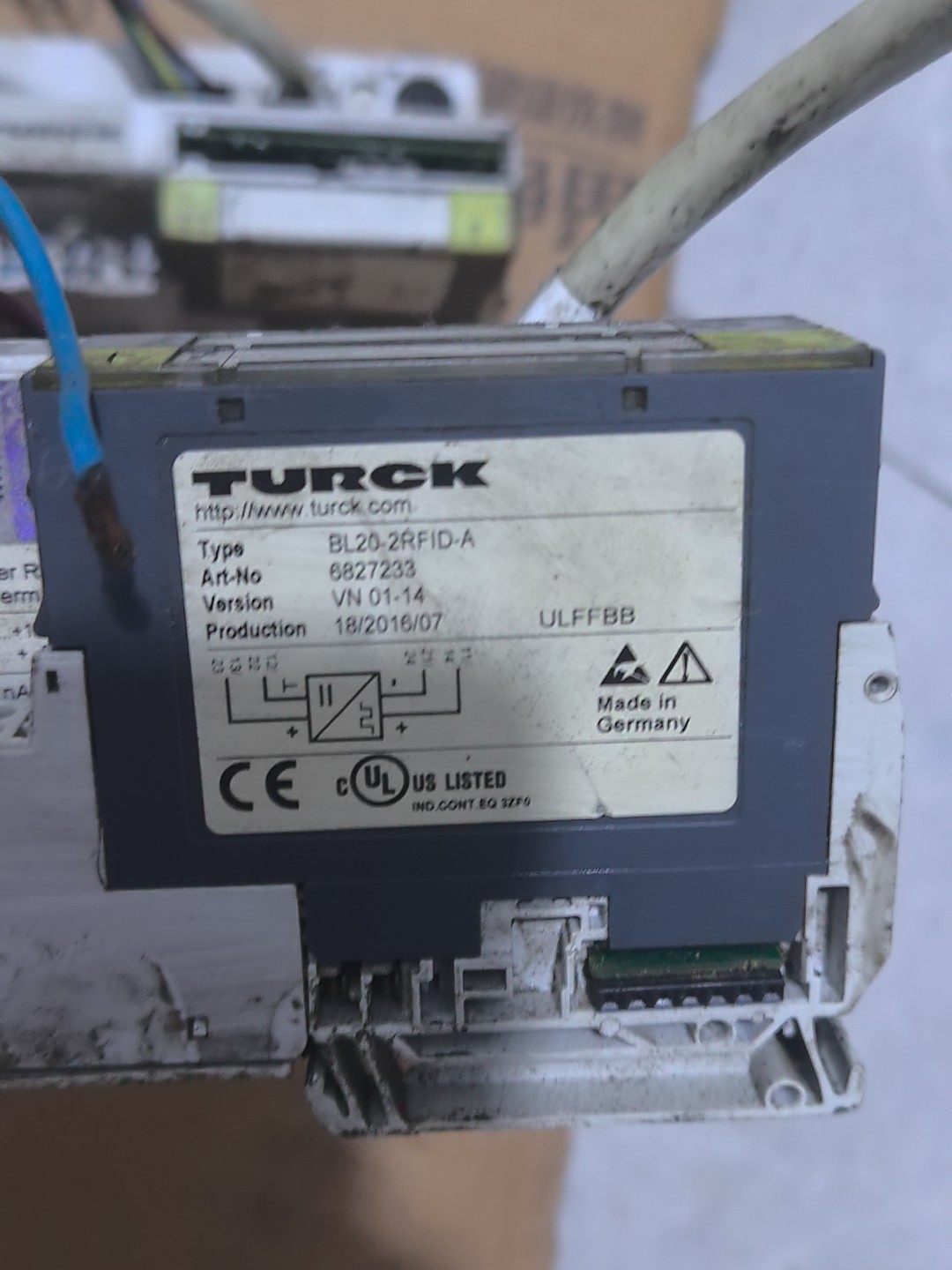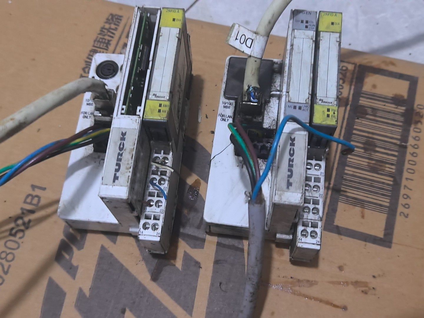 本产品为拆机二手TURCK图尔克BL20系列总线模块,包含BL20-2RFID-A和BL20-GW-DVP1两个型号,共两台设备打包出售。设备外观存在使用痕迹、灰尘及污渍,部分接口处连接有彩色线缆,整体功能需买家自行测试,不提供技术支持。