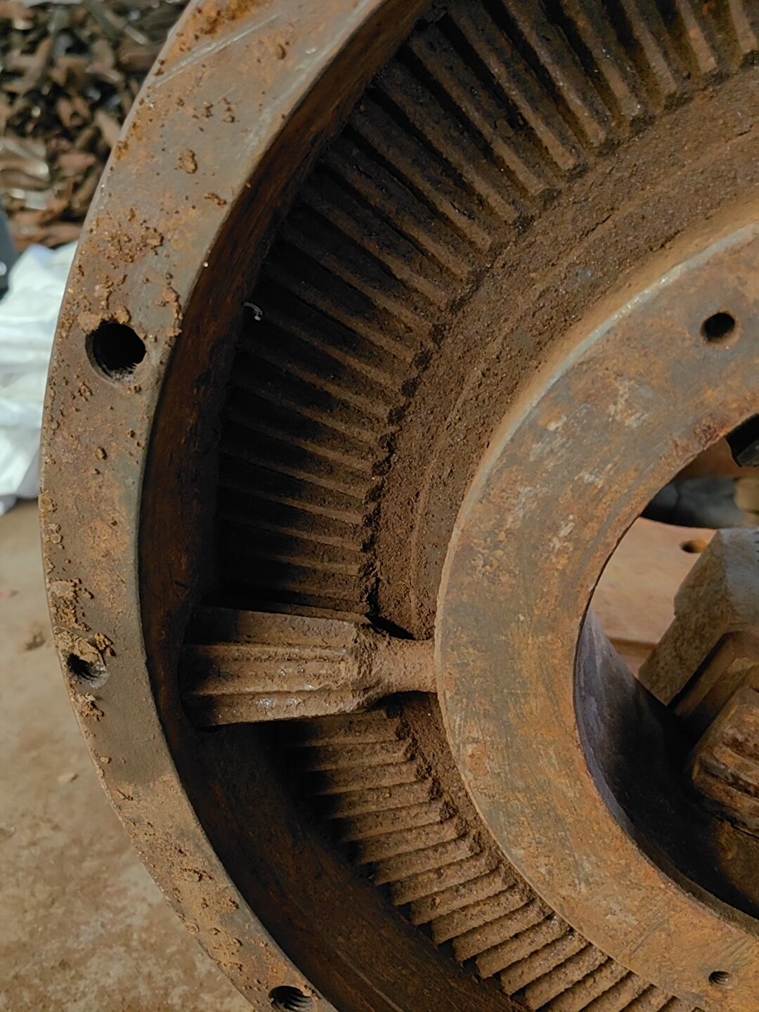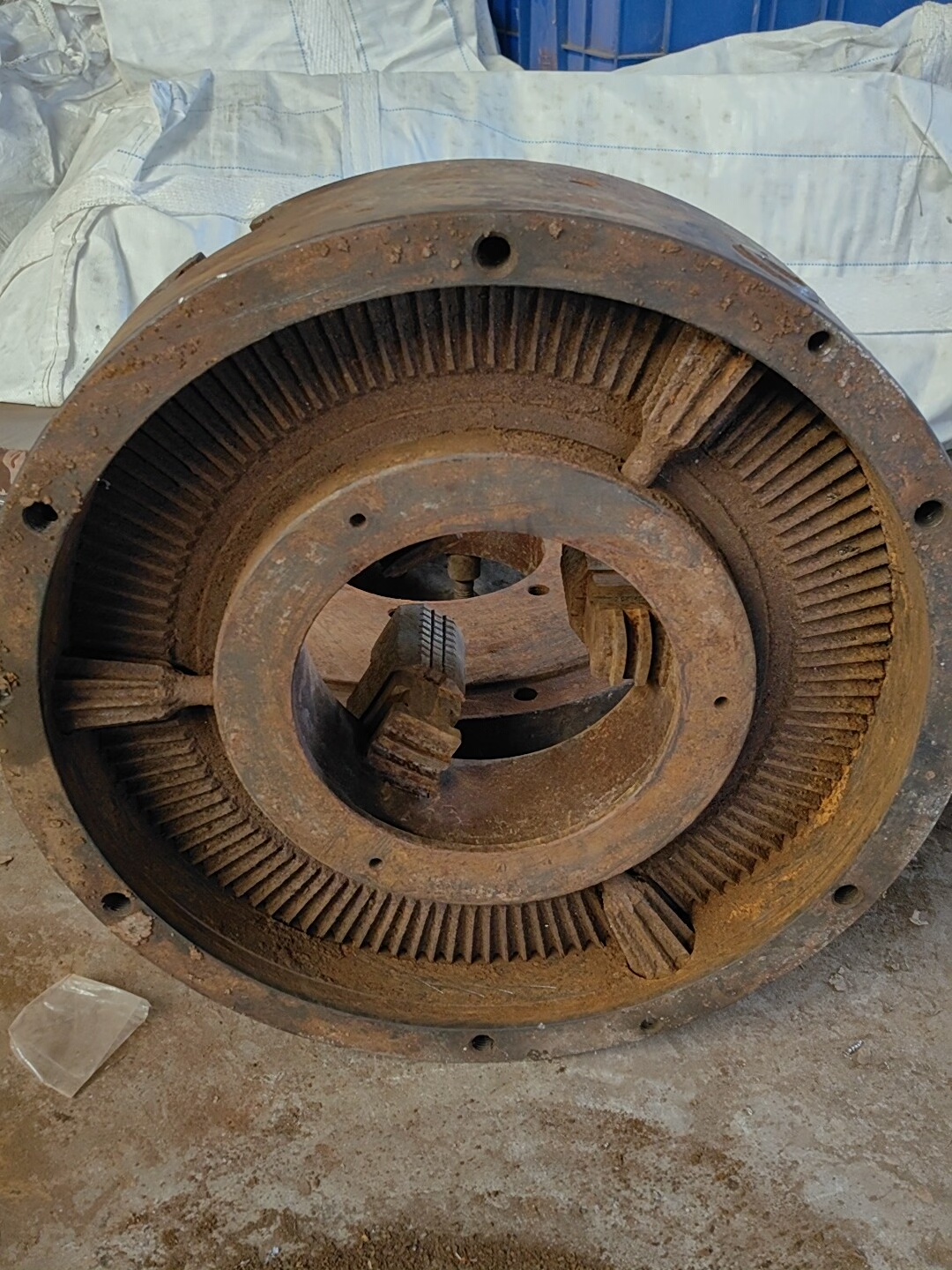 本产品为未知品牌500三爪联动卡盘,型号500,主要用于机床加工过程中对工件的夹持固定。卡盘整体为金属材质,采用三爪结构设计,通过螺栓固定卡爪位置。由于长期使用及存放环境影响,表面存在明显锈迹,且磨损较大,目前已无法正常使用,仅作为配件出售,适用于需要维修或拆解利用零件的场景。