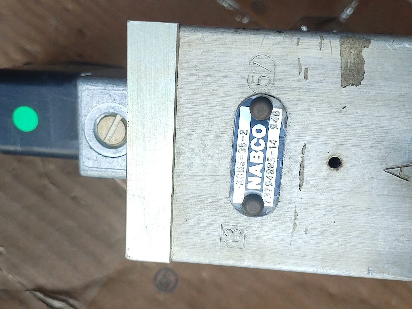 本产品为NABCO品牌气动阀,型号EGVS-38-2,属于二手拆机件。产品功能正常,成色如图所示,表面有使用痕迹,整体结构为银色金属阀体,配备黑色电磁阀线圈,顶部和底部设有管道接口,适用于工业自动化气动控制系统中气流的通断或方向控制。