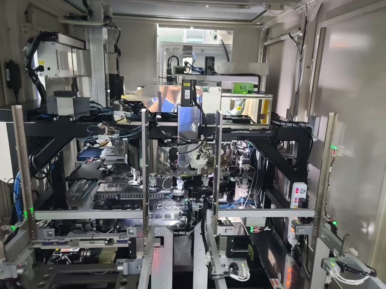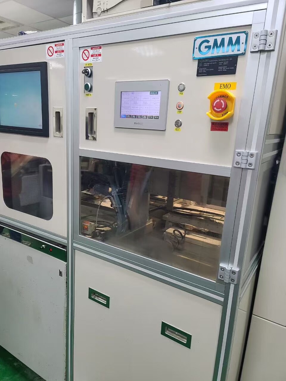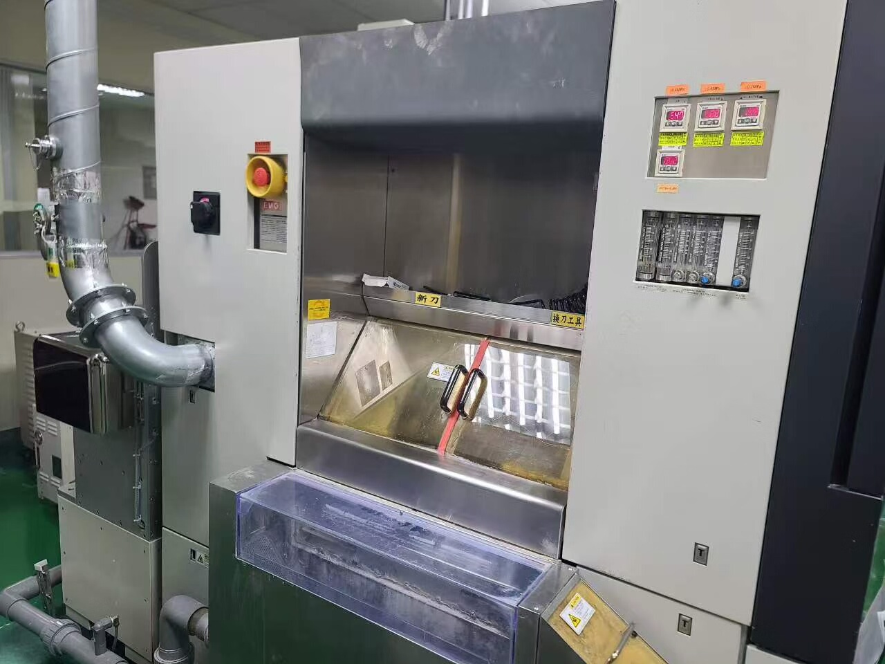 设备采用工业机柜式设计,结构稳固,白色外观整洁。机身集成多组透明观察窗,便于实时监控切割过程;配备显示屏及键盘鼠标操作单元,人机交互友好。整体运行状态稳定,内部核心部件保养完好,可直接投入生产使用。