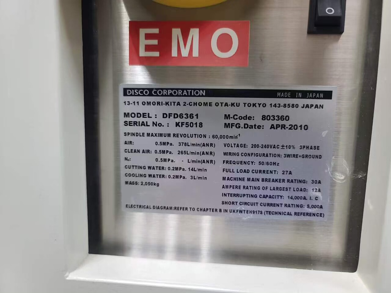 本设备为日本DISCO品牌DFD6361型号切割机,生产于2010年4月,型号标识803360,序列号KF5018。作为一款精密切割设备,其性能稳定,适用于多种工业材料的高精度切割加工,目前设备运转正常,内部零件完好,实物拍摄如图所示。
