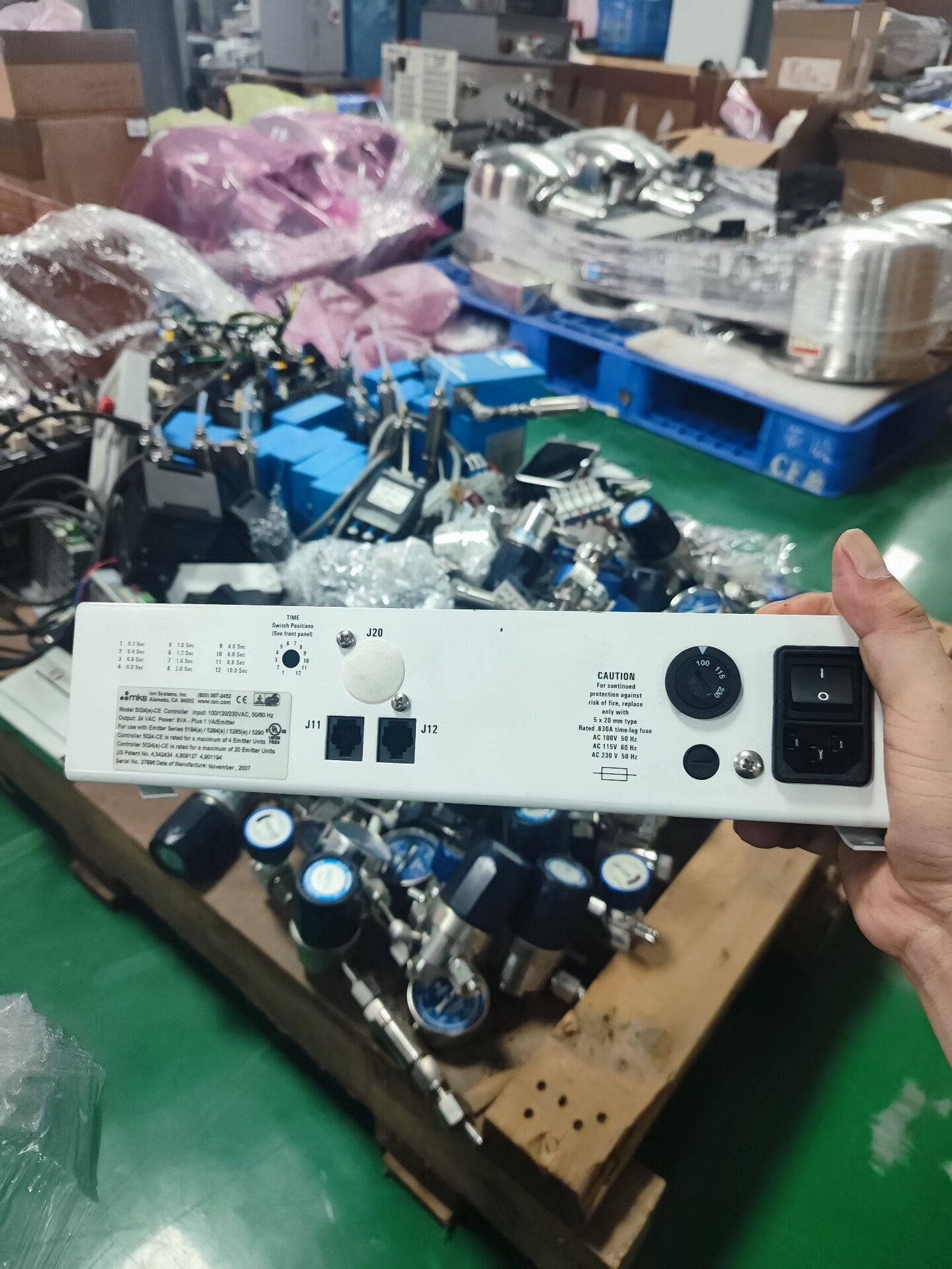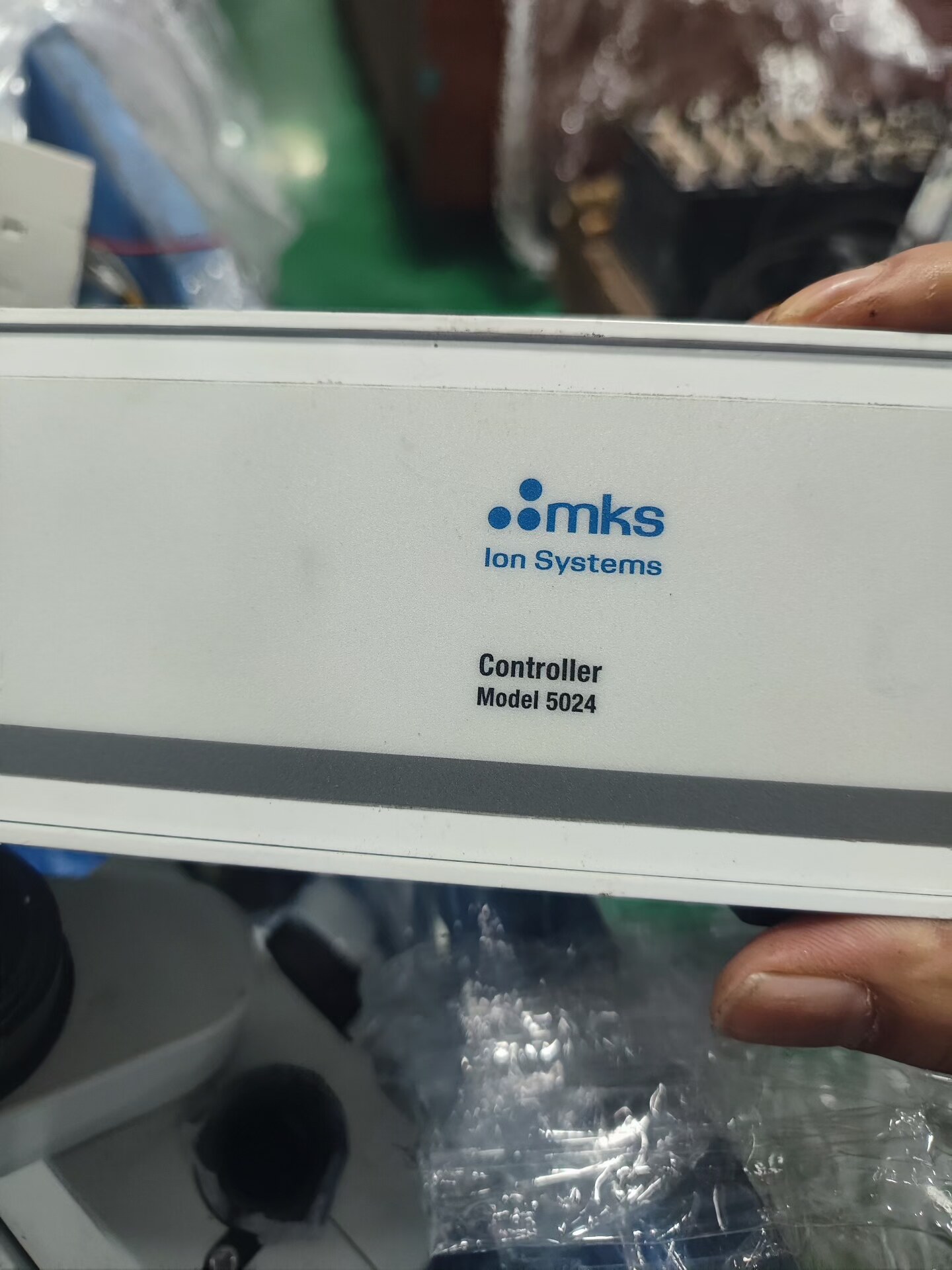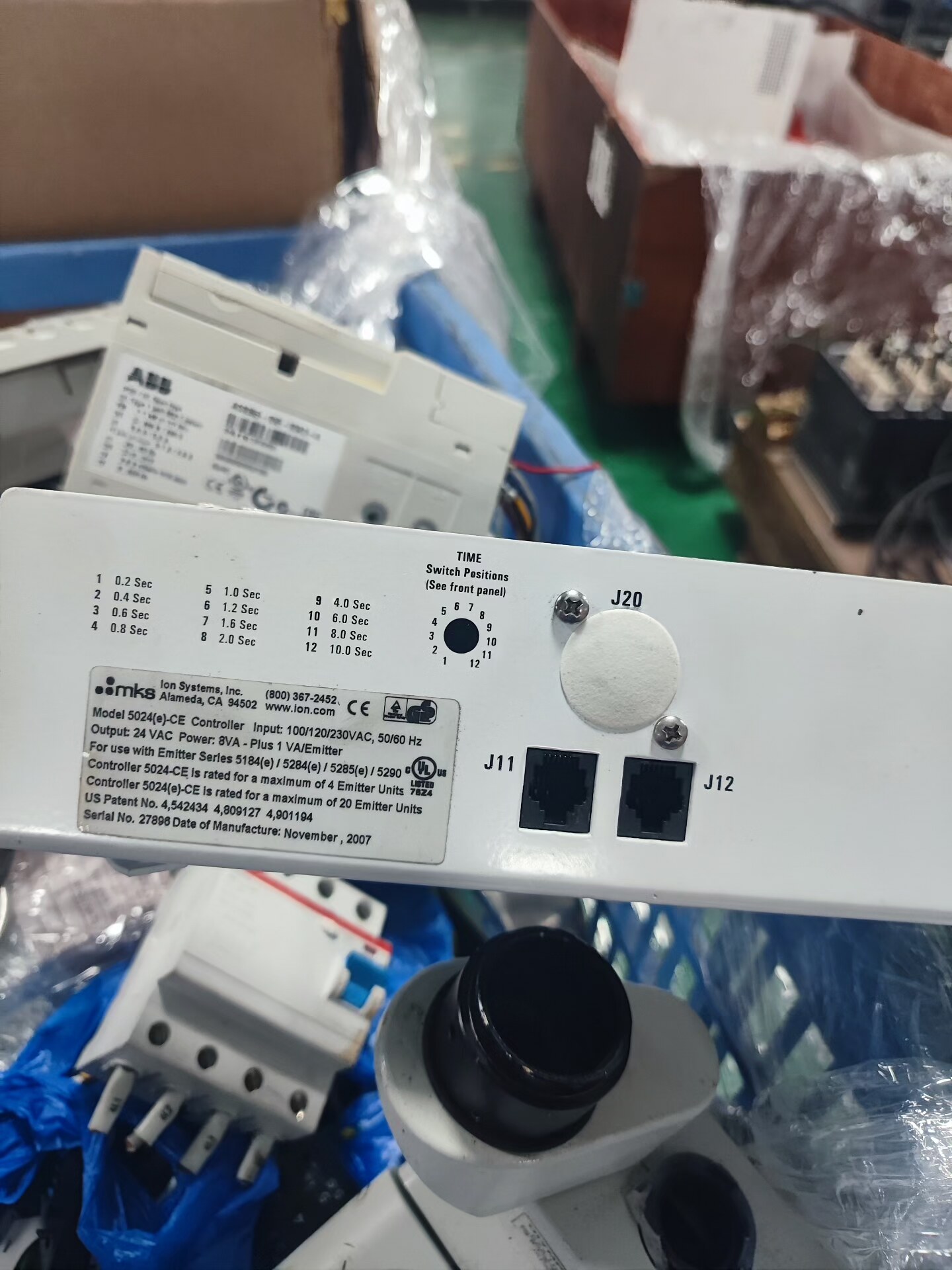 本产品为MKS Ion Systems生产的5024(e)-CE型号控制器,于2007年制造,是一款专为Emitter系列离子设备设计的工业控制单元。设备采用白色外壳,前面板配备调节旋钮和状态指示灯,整体设计简洁实用,适用于各类工业自动化环境。