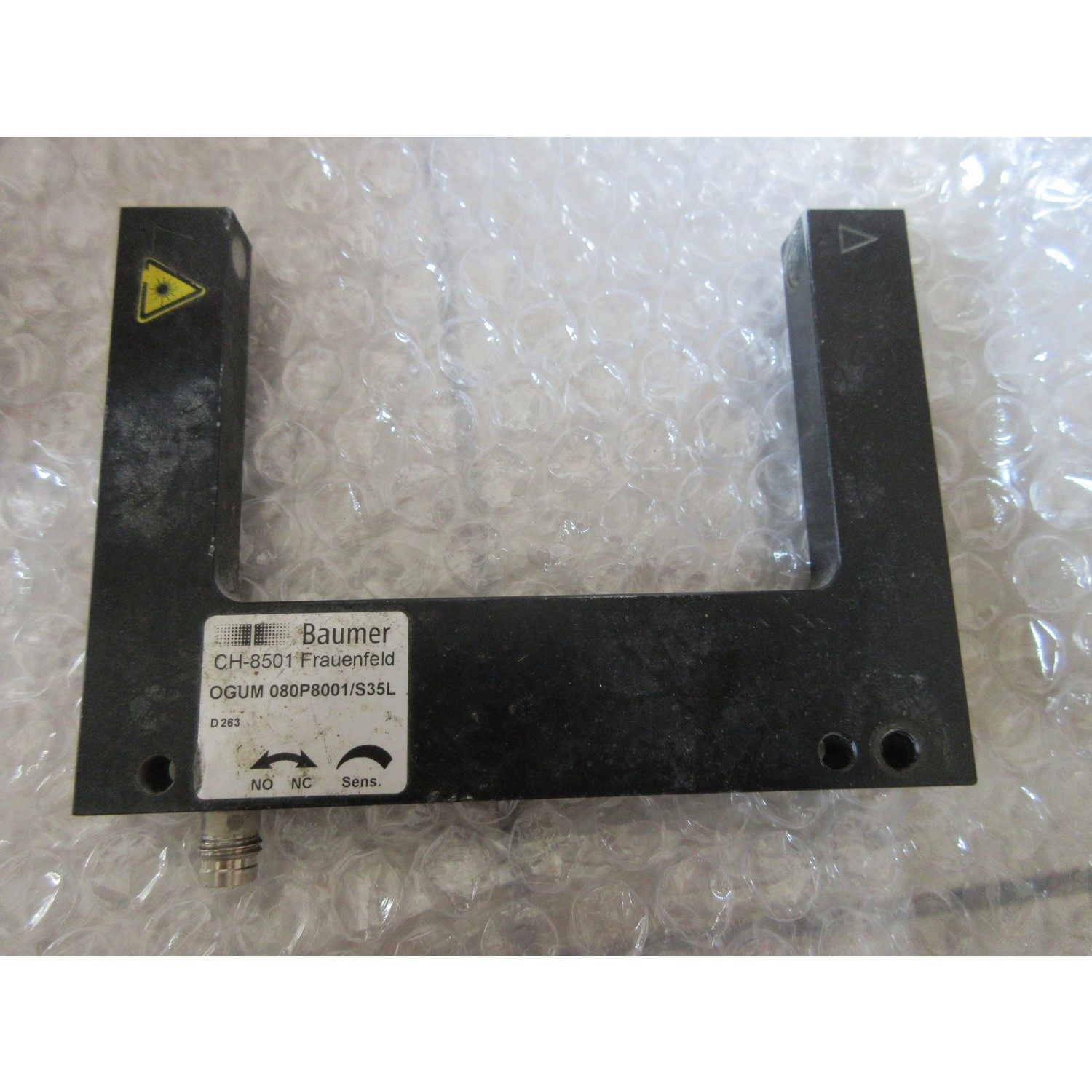 Baumer OGUM 080P8001/S35L 是一款拆机正品槽型光电传感器,由瑞士Baumer公司生产,型号为OGUM 080P8001/S35L,适用于工业自动化领域的物体检测场景。产品采用黑色槽型结构设计,集成金属连接器,具备NO(常开)和NC(常闭)触点输出功能,能够稳定可靠地实现对物体通过的精准检测。