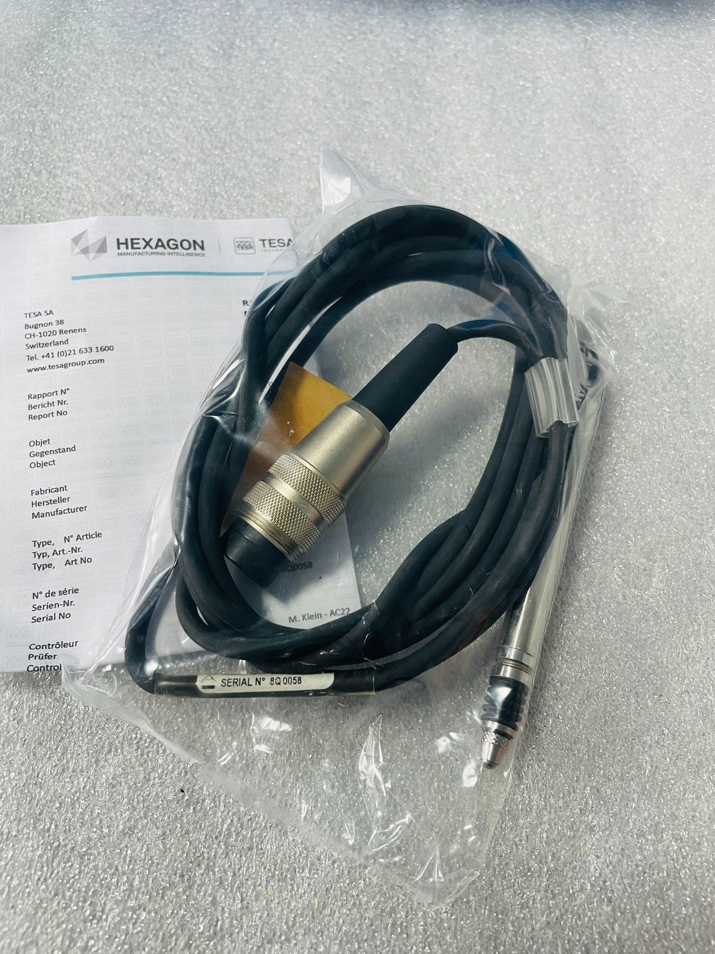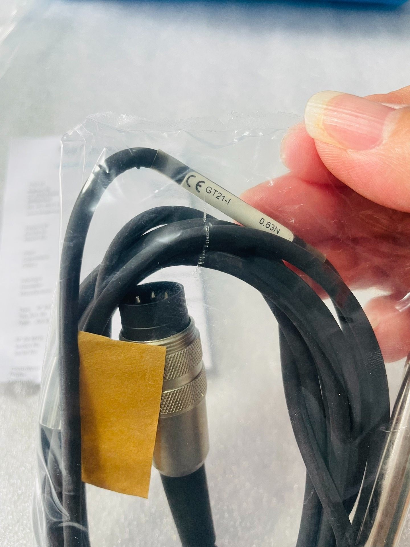 本产品为HEXAGON旗下TESA品牌的GT21-I型号测量探头,全新未使用状态,内包装完好,无外包装盒。产品设计精密,采用黑色耐用线缆,一端配备金属连接器(带防滑纹路,便于插拔),另一端为金属测量探头,确保测量过程中的稳定性和准确性。关键参数为0.63N,适用于对测力有特定要求的精密测量场景。