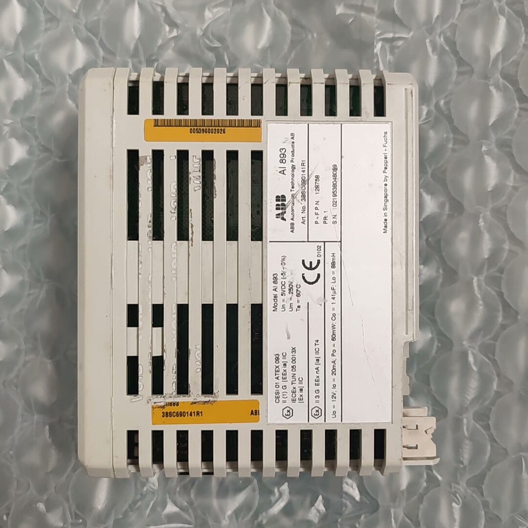 本产品为ABB品牌旗下的AI893型号PLC模块,具体型号为3BSC690141R1,属于二手拆机原装正品。设备整体采用蓝色面板设计,搭配白色标签区域,顶部设有F(故障)、R(运行)、W(警告)三个状态指示灯标识,底部清晰印有型号及参数信息“0/11.612”,整体结构紧凑,适用于工业自动化控制系统中的信号采集与处理。
