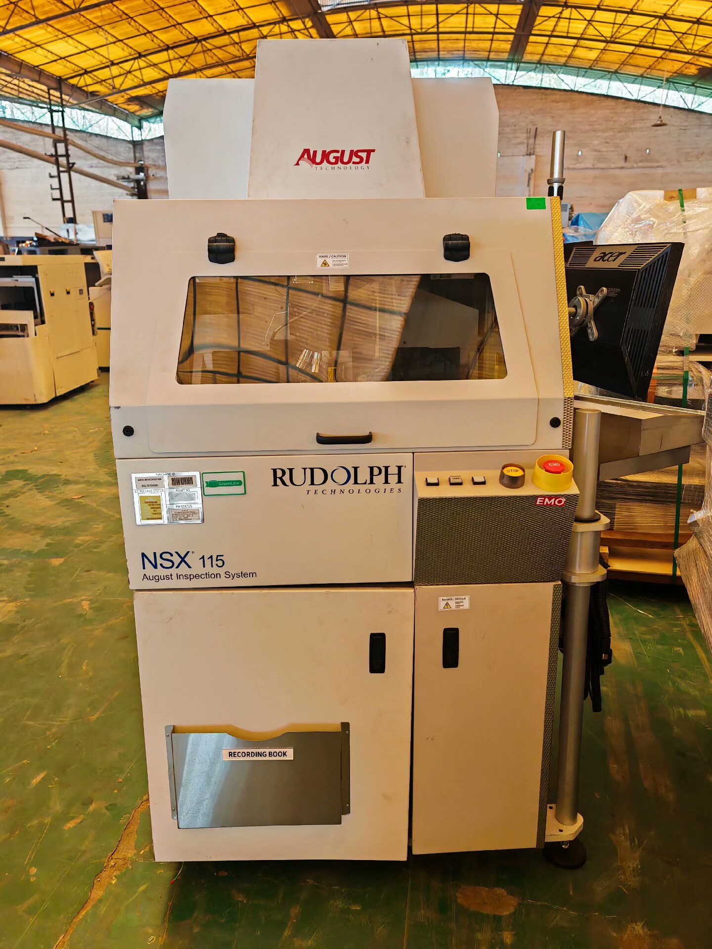 鲁道夫 NSX 115 检测系统是一款工业级质量检测设备,隶属于GreenLine系列,专为生产线产品质量控制设计。设备整体采用白色工业机身,结构紧凑,配备金属信息标签,包含Machine ID(MES: WINSX00106)、资产编号(EQ:30104287)等管理信息,便于设备追踪与维护。
