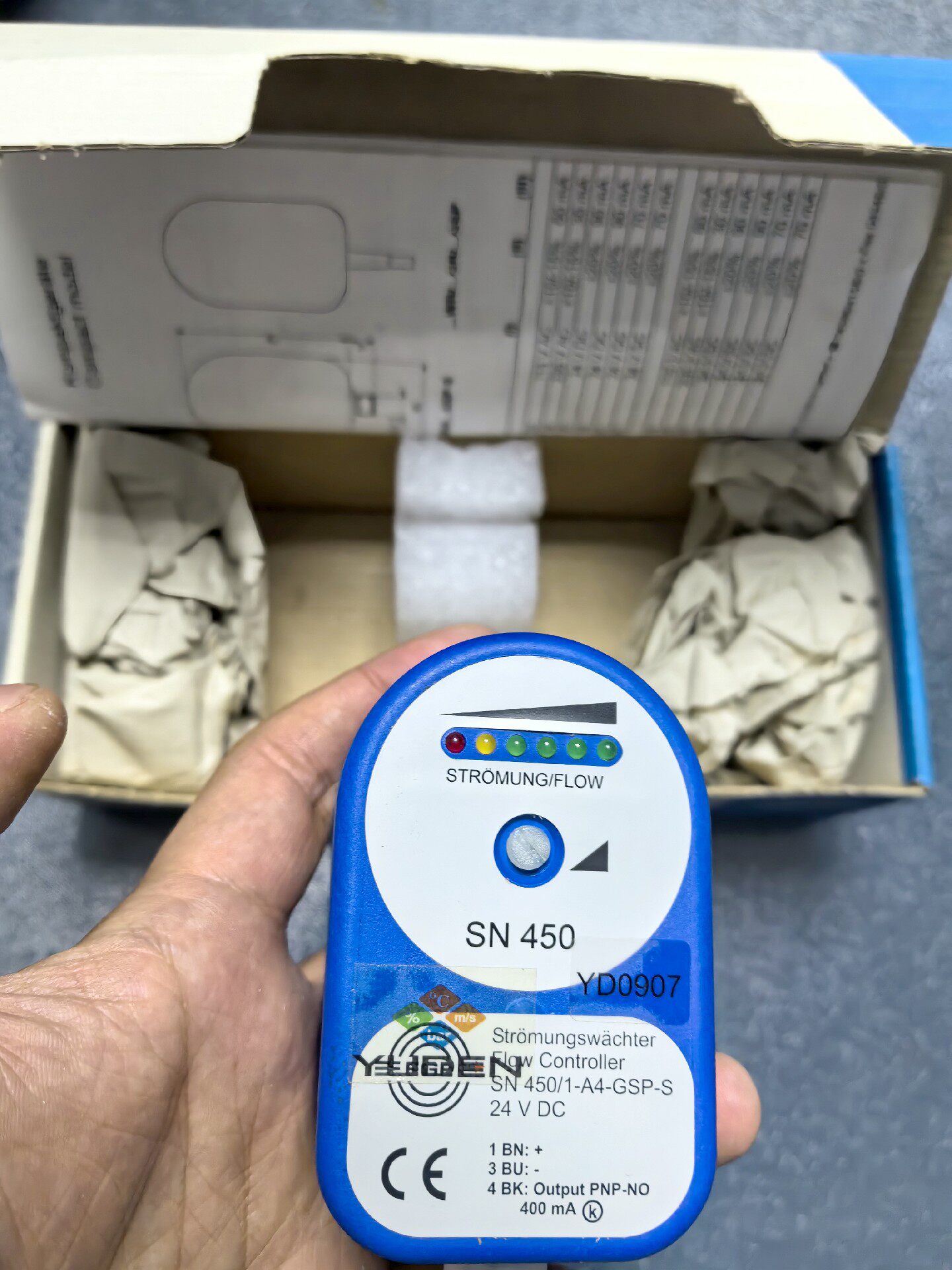 本产品为EGE-Elektronik品牌旗下的紧凑型流量传感器,型号为SN 450/1-A4-GP-S,采用蓝色包装盒包装,内含传感器主体及相关产品说明书,确保产品全新未使用。