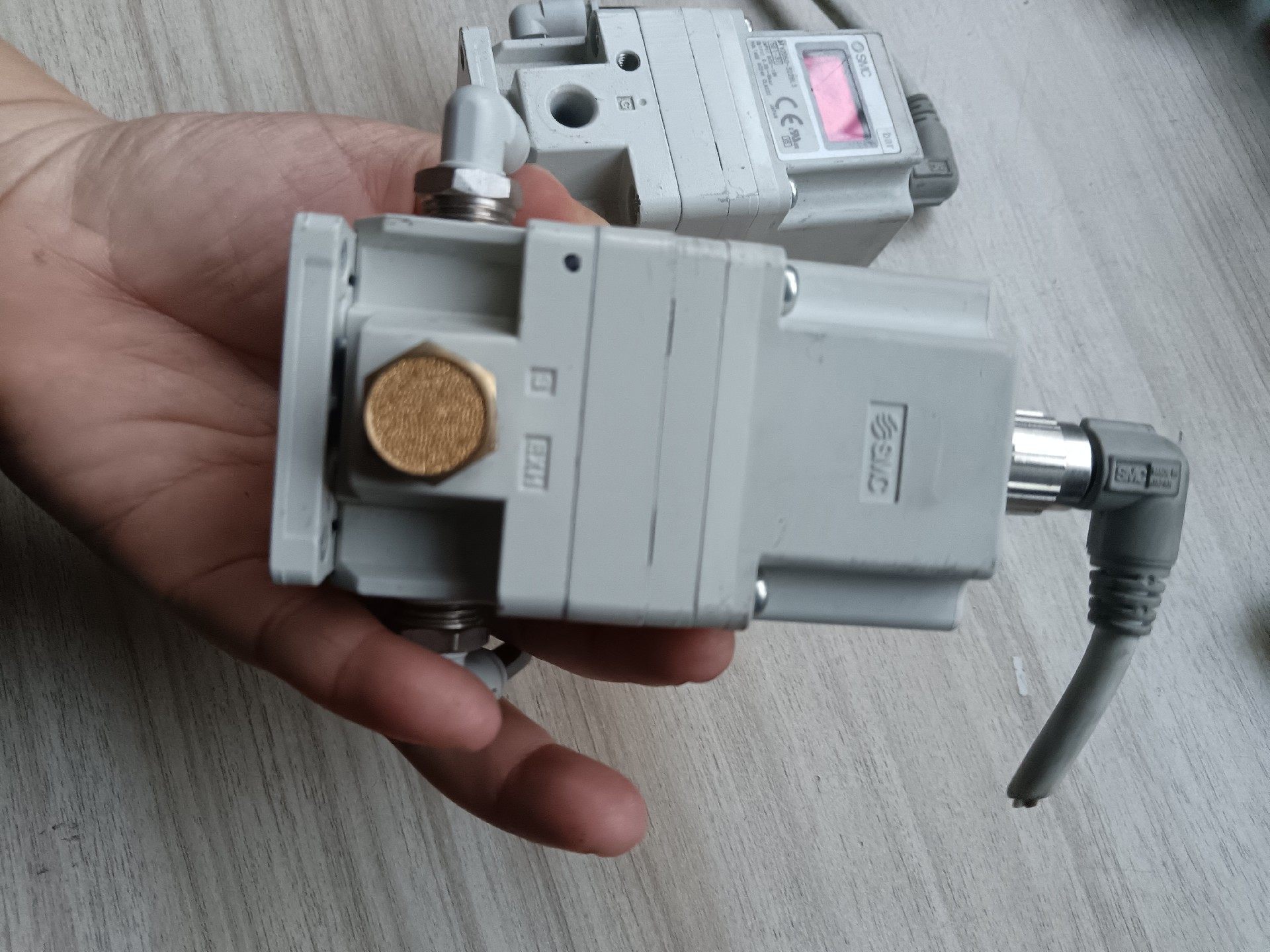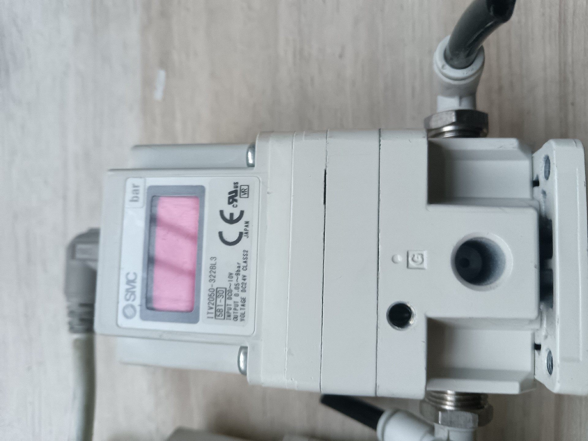 SMC ITV2050-322BL3 电气比例阀是一款高精度气动控制元件,专为需要精确调节气压的工业自动化场景设计。产品采用白色工程塑料外壳,集成红色数字显示屏,可直观显示实时压力值(单位:bar),配备气动接口及信号线缆,便于系统集成与信号传输。