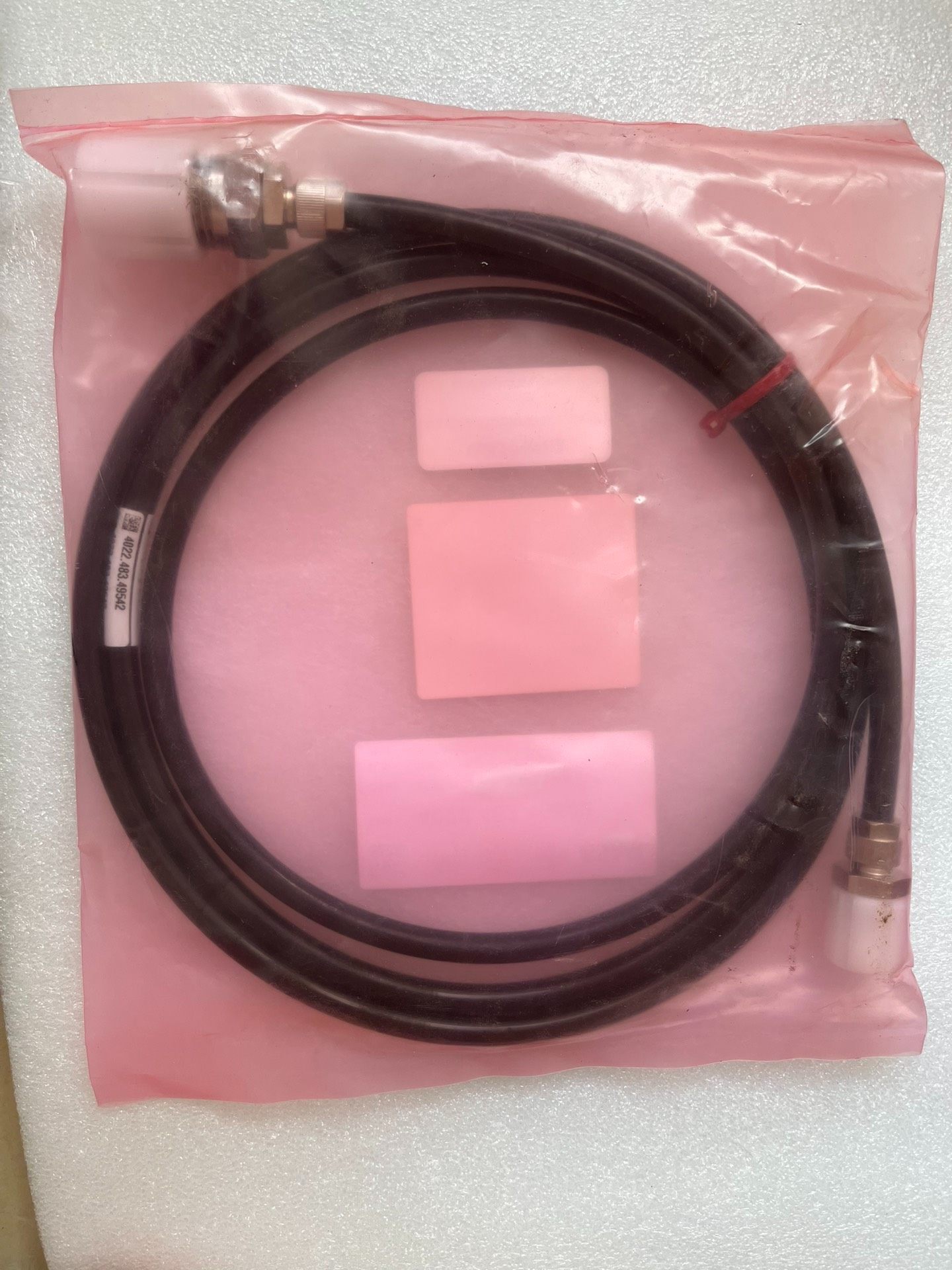 产品密封于粉色防静电包装袋中,附带ASML原厂标签,包含型号、序列号(SN: 104302HLE)、生产日期(01/09/2011)等信息,可追溯性强。每包内含两根气管,满足设备维护或更换需求。