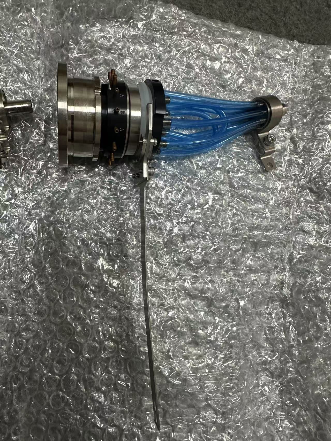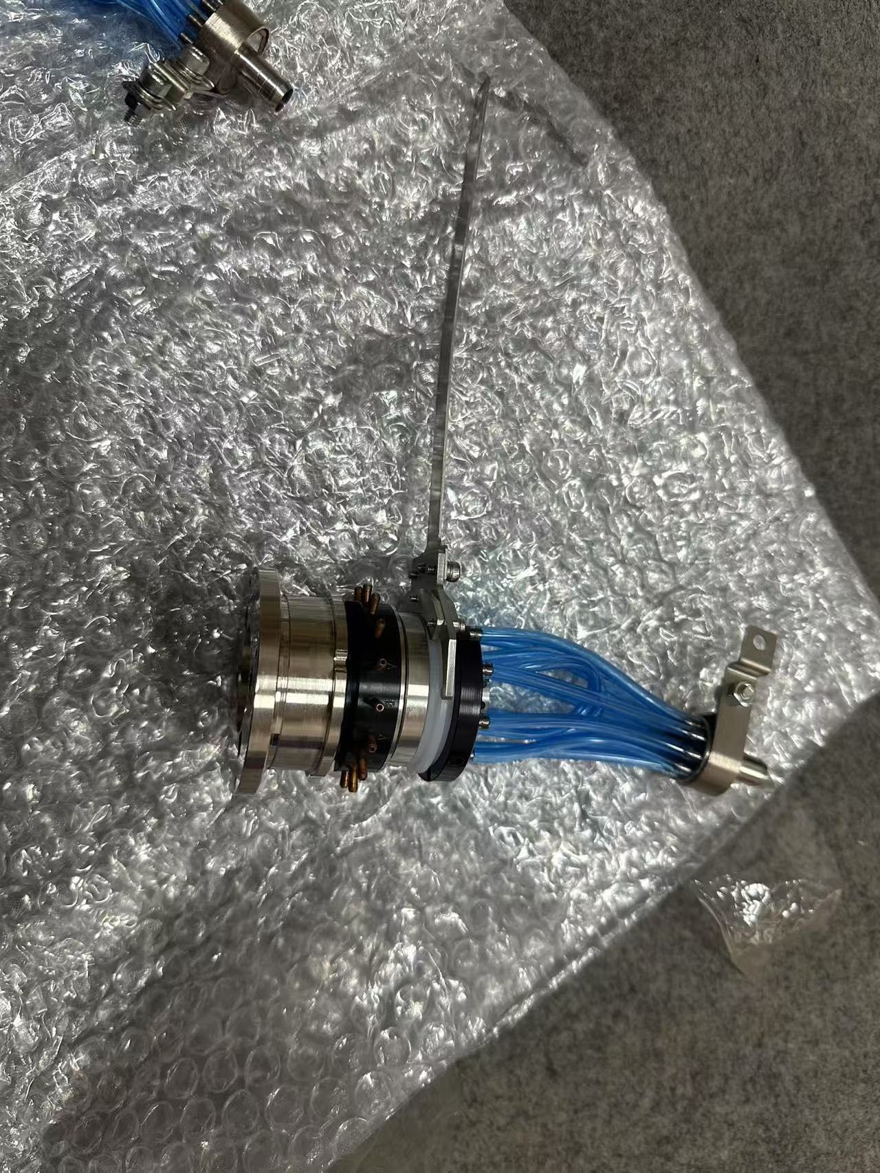 本产品为ASM品牌工业连接器,采用金属材质外壳,结构坚固耐用,适用于各类工业环境。顶部设计有法兰盘,便于安装固定;中部引出多根蓝色线缆,确保信号或电力传输的稳定性;底部配备标准连接接口,可快速对接设备,搭配金属固定支架,提升整体安装的稳固性。