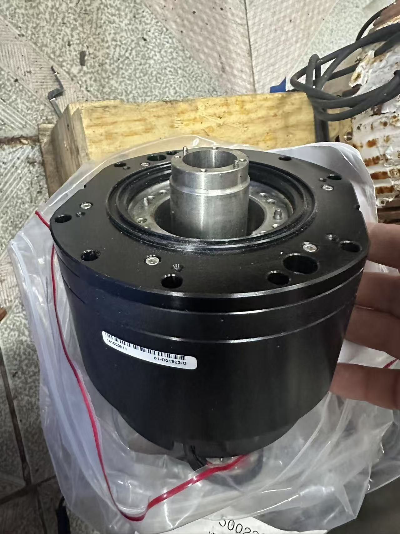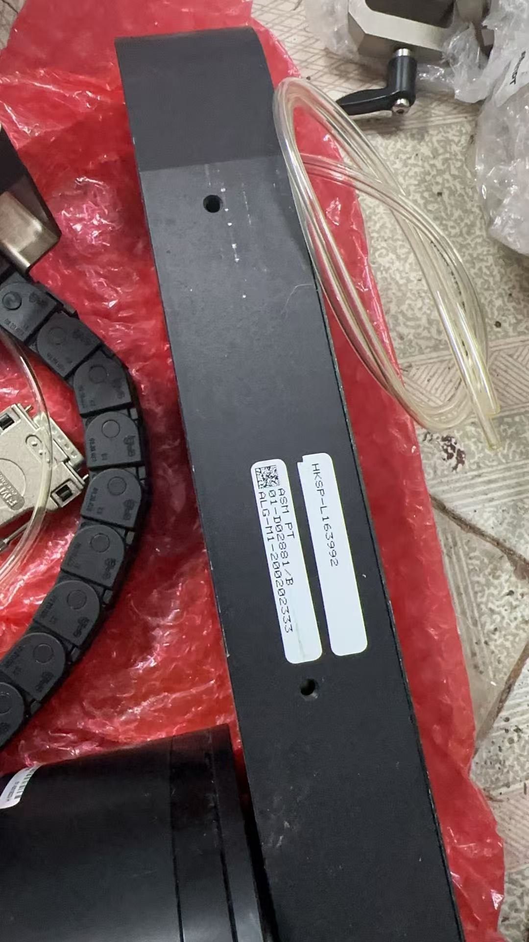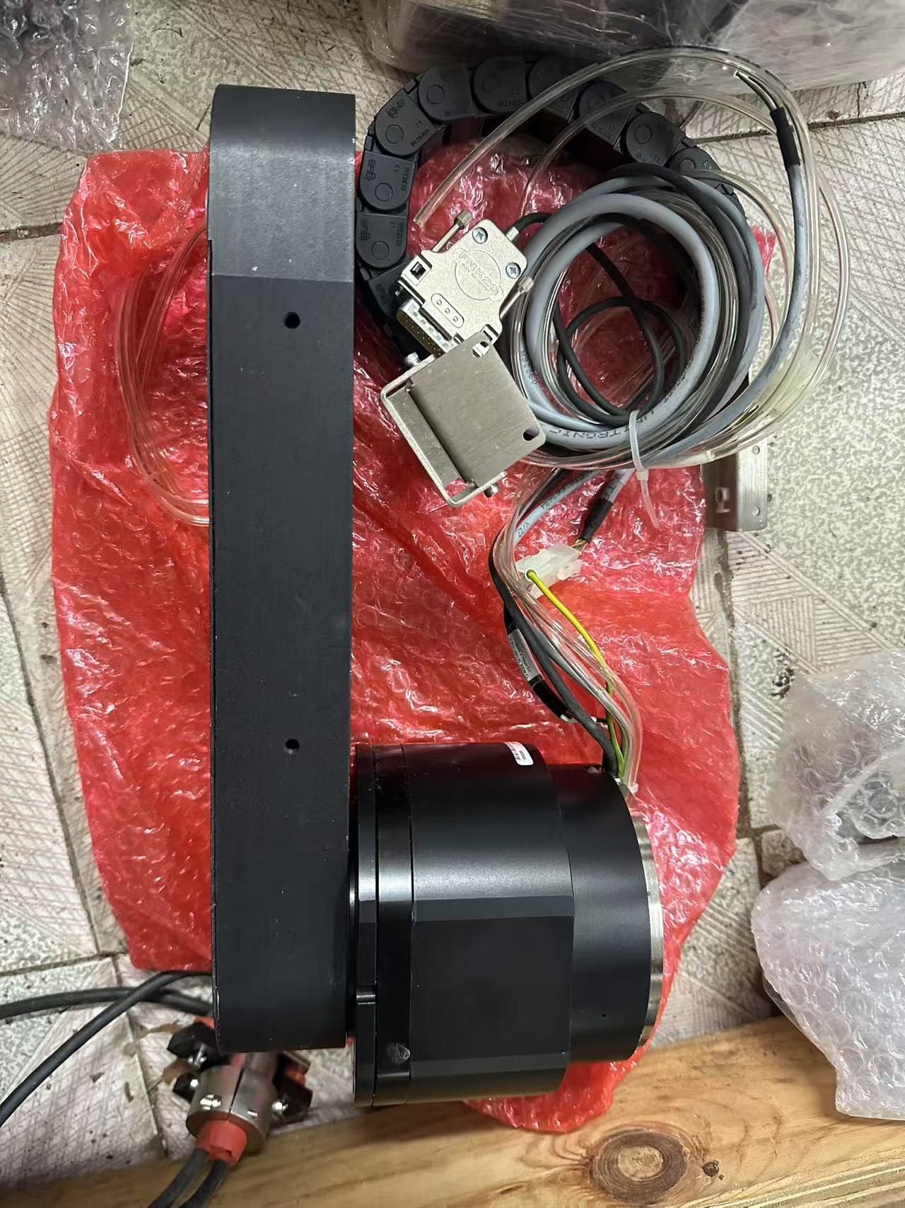 本产品为ASM品牌的HG-1-10352型号中空旋转平台,采用黑色机械结构设计,集成旋转部件、拖链、编码器及线缆组件,整体结构紧凑,适用于高精度旋转定位场景。配备编码器(Omron品牌),确保旋转角度的精准控制,拖链设计保护线缆,提升设备运行稳定性。