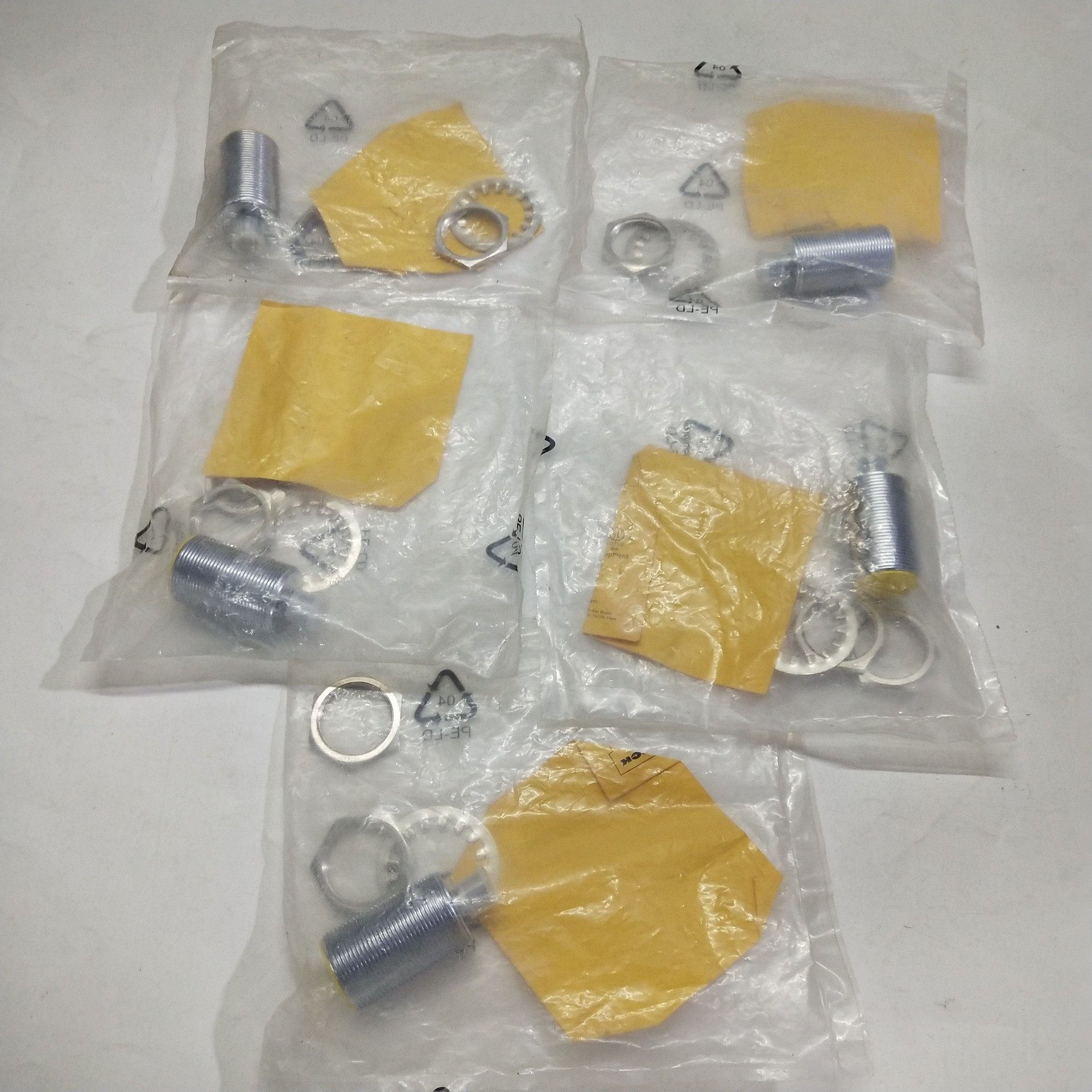 图尔克Bi10-G30K-AP6X-H1141接近传感器为全新未拆封产品,采用银色金属外壳,圆柱形螺纹设计,结构紧凑,安装便捷。产品配有专用安装垫圈,确保在工业环境中稳定固定。每个传感器独立包装于透明塑料袋内,附带黄色产品标签,标注产品型号及相关认证信息,保证产品 authenticity。
