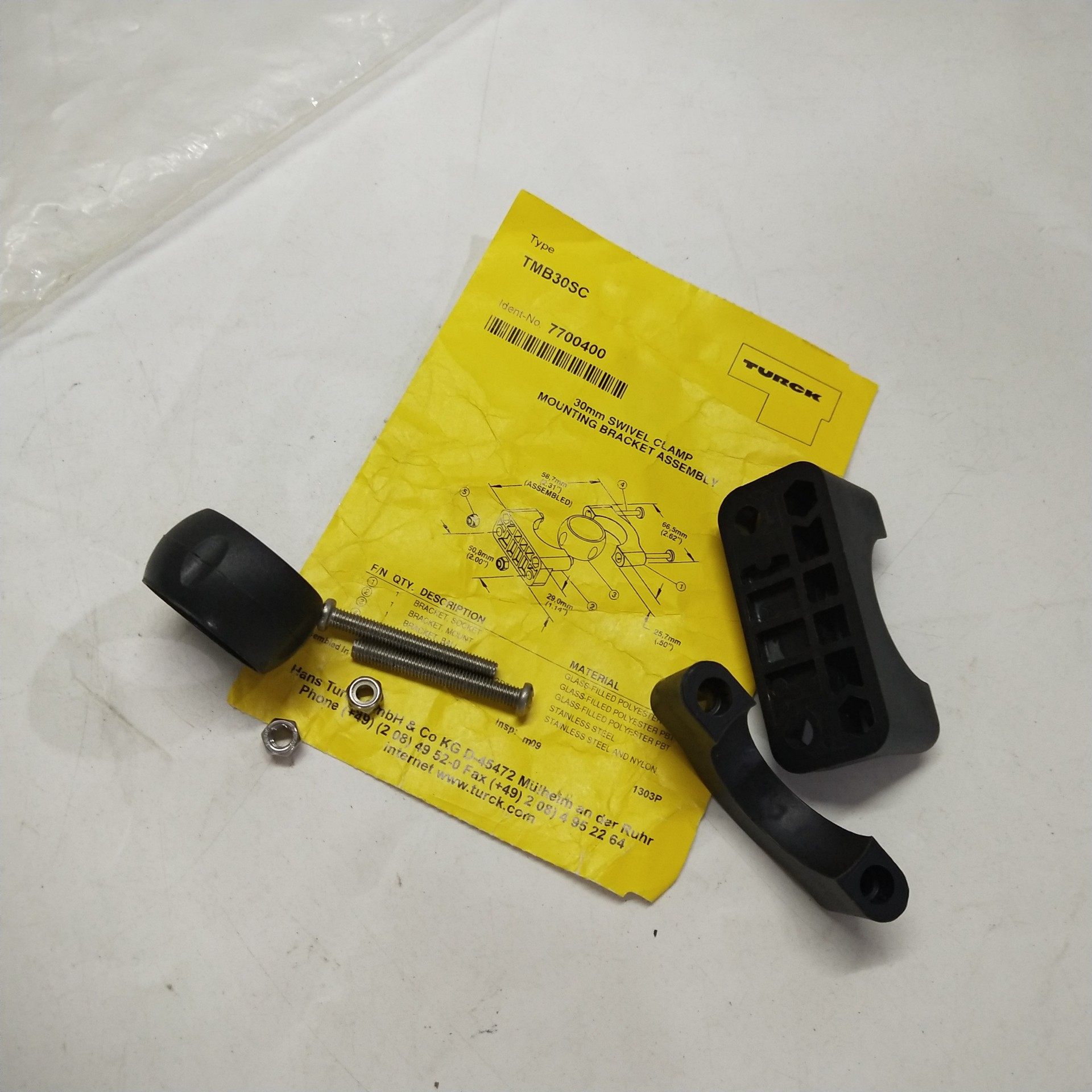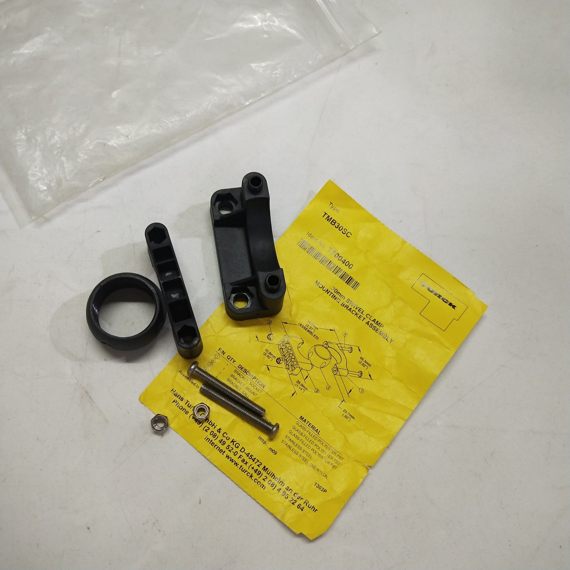 本产品为图尔克(TURCK)原装正品安装支架,型号TMB30SC,货号7700400,属于旋转夹安装支架组件(MOUNTING BRACKET SWIVEL CLAMP ASSEMBLY),专为工业自动化设备的固定与安装设计。