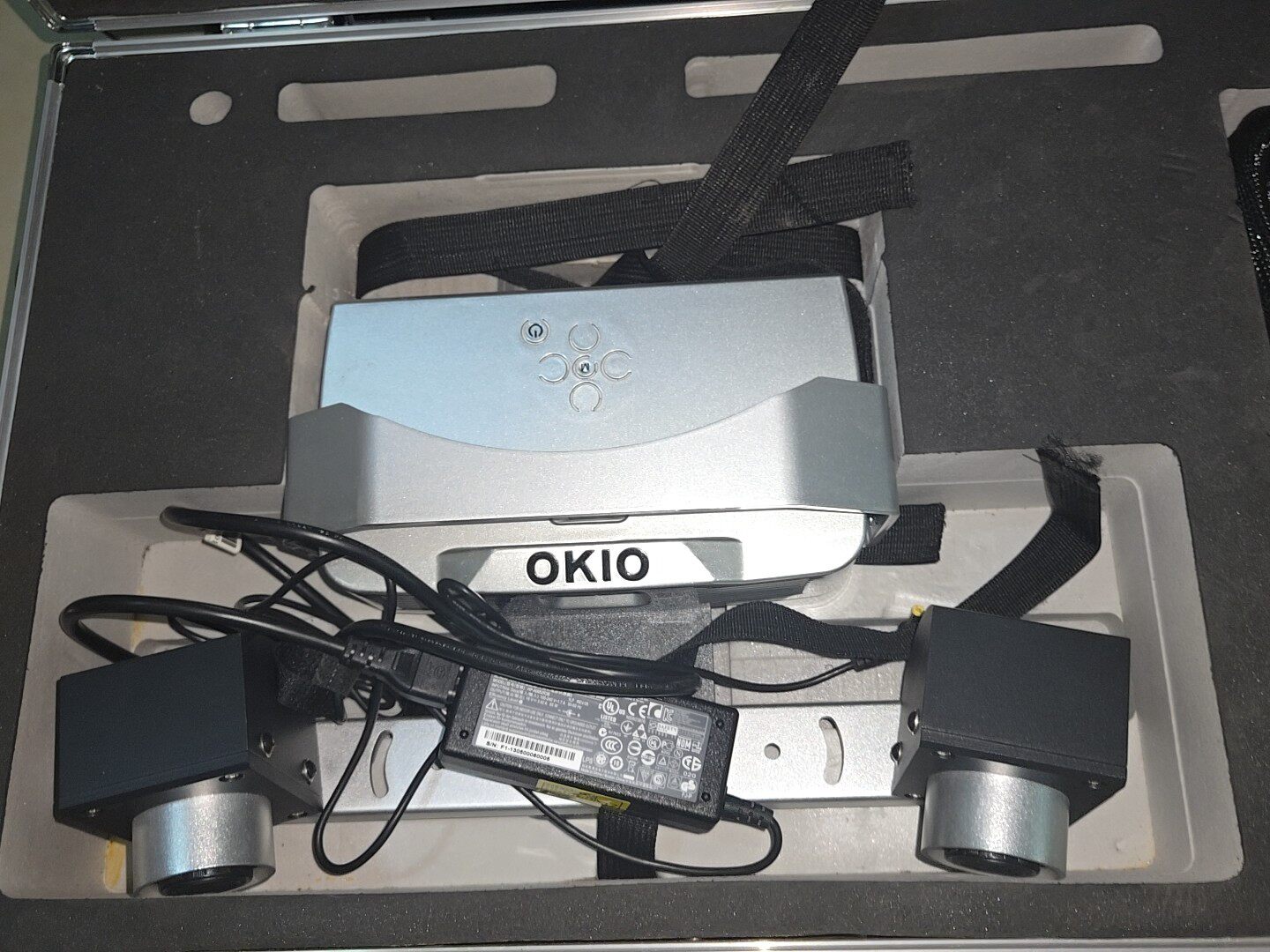 OKIO手持三维扫描仪是北京天远三维扫描技术有限公司研发的便携式三维数据采集设备,设备主体采用银色金属质感外壳,表面印有OKIO品牌标识,设计轻巧便携,适合手持操作。作为库存机,设备性能完好,可正常投入使用,配备专用金属防护箱,内部泡沫内衬精准契合设备及配件轮廓,有效保障运输与存储过程中的安全性。