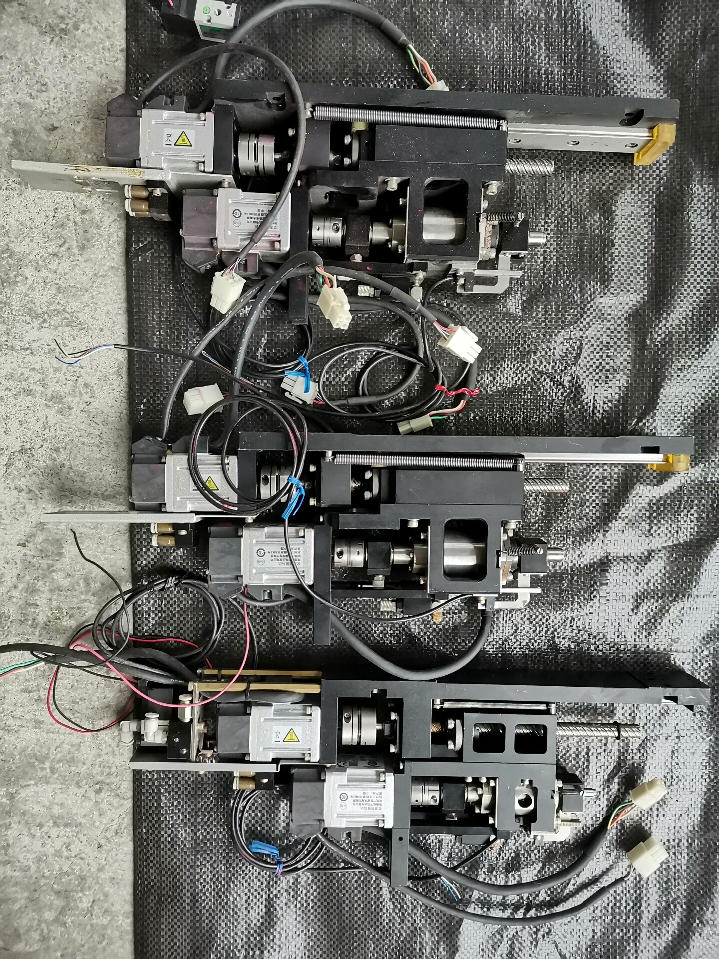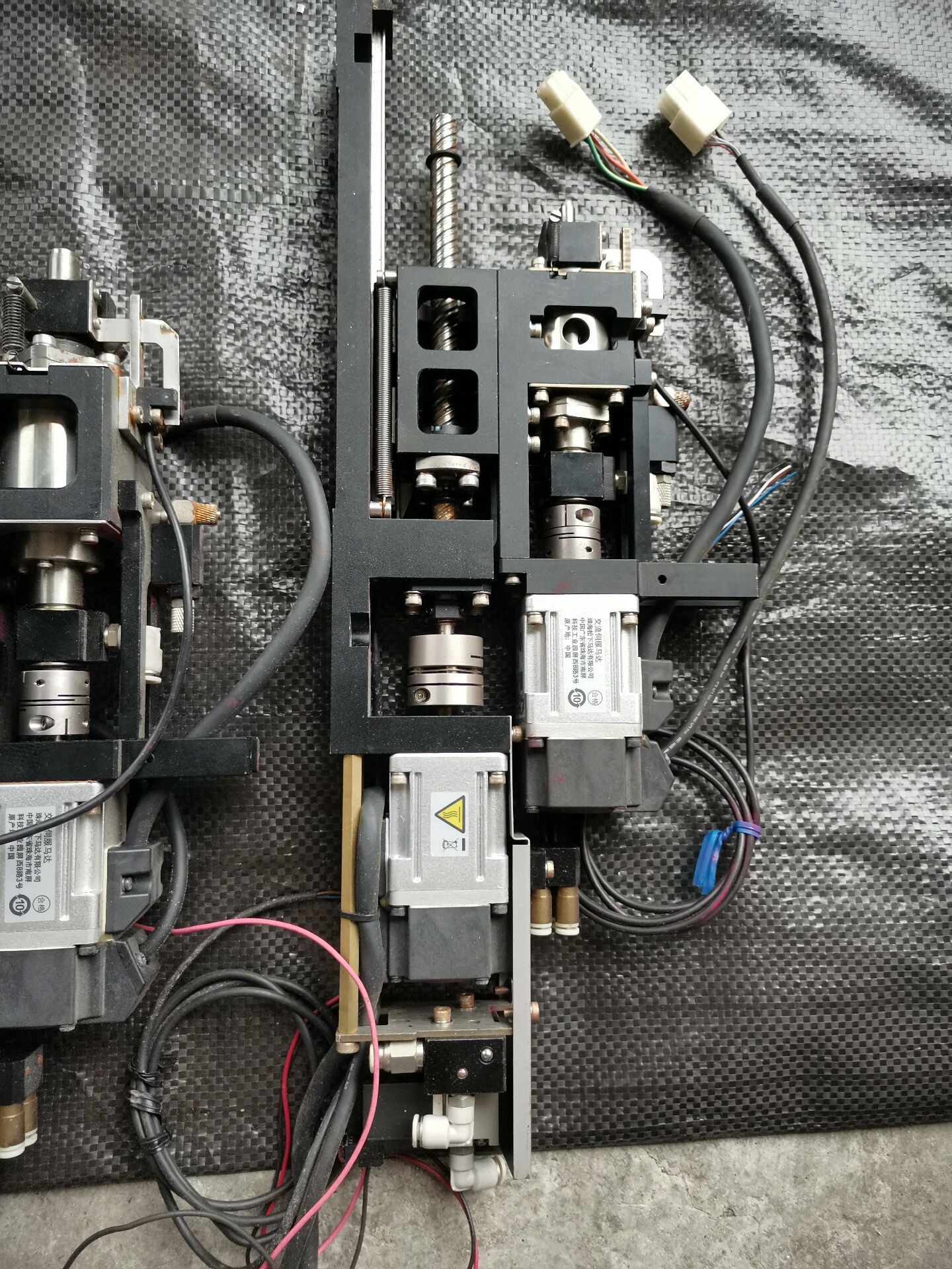 本产品为贴片机工作头,共3套,实物拍摄。采用金属材质机械结构,集成多个精密机械连接件、布线及可能的传感器或驱动组件,整体结构紧凑,适用于SMT(表面贴装技术)生产线中的贴片机设备,主要功能为实现电子元件的精准拾取与放置操作。