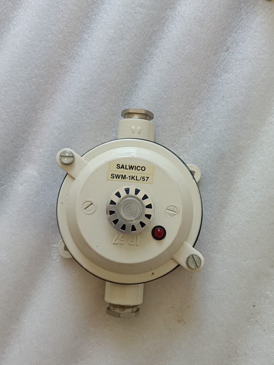 - 外观:白色圆形外壳,带安装孔及双接线端口