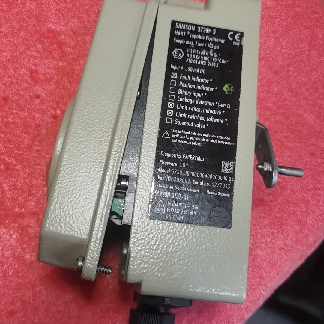萨姆森3730-3系列阀门定位器是一款高性能工业控制仪表,专为各类工业阀门的精确位置控制设计。本产品型号为3730-381000004000010.04,版本1.61,具备防爆特性,适用于存在易燃易爆环境的工业场所。设备状态良好,测试功能正常,集成接近开关位置反馈,可实时监测阀门位置,确保控制精度与系统稳定性。