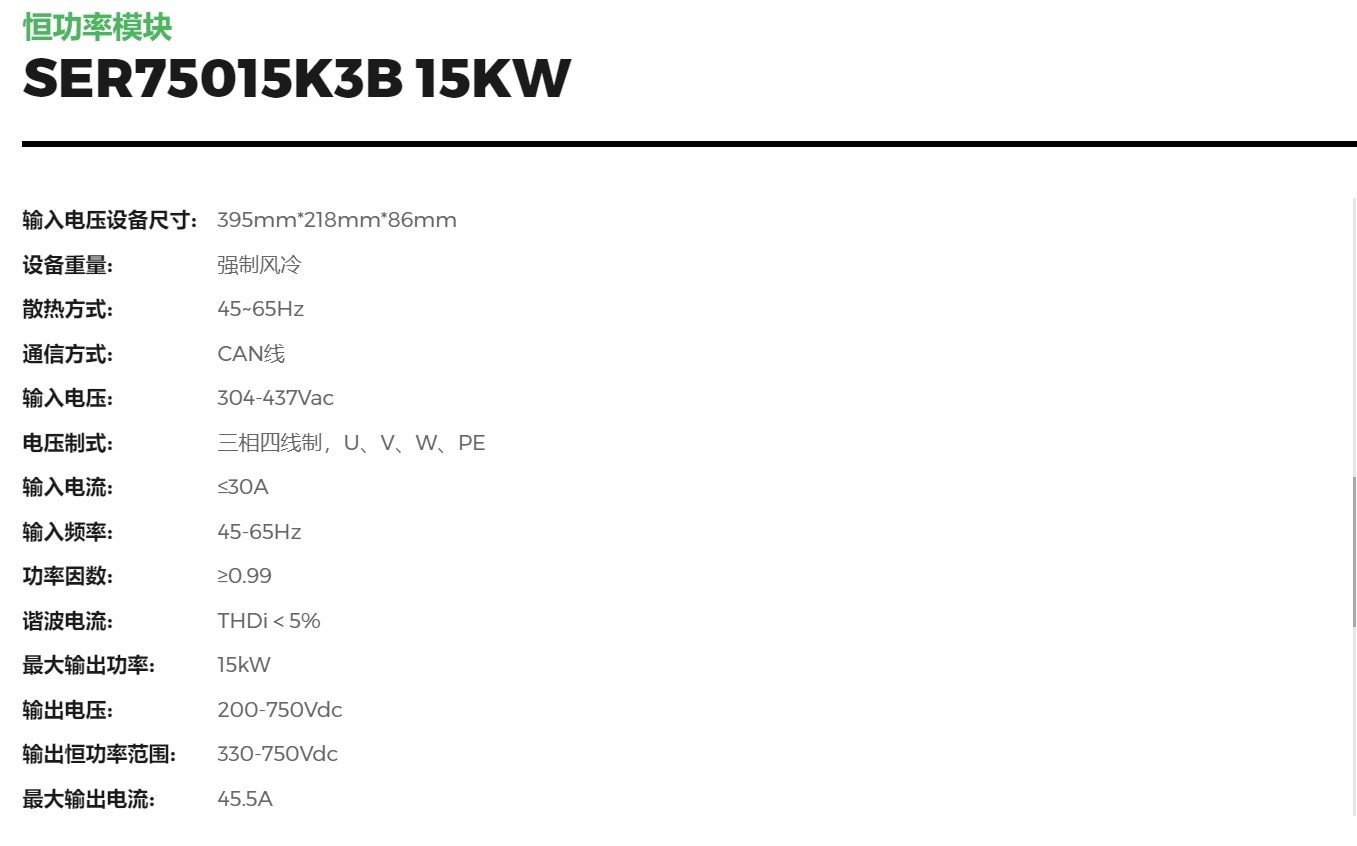 盛弘SER75015K3B 200-750VDC 0-45A 15KW 恒功率直流充电模块 原装拆机的成色八成新 功能正常,需要的联系